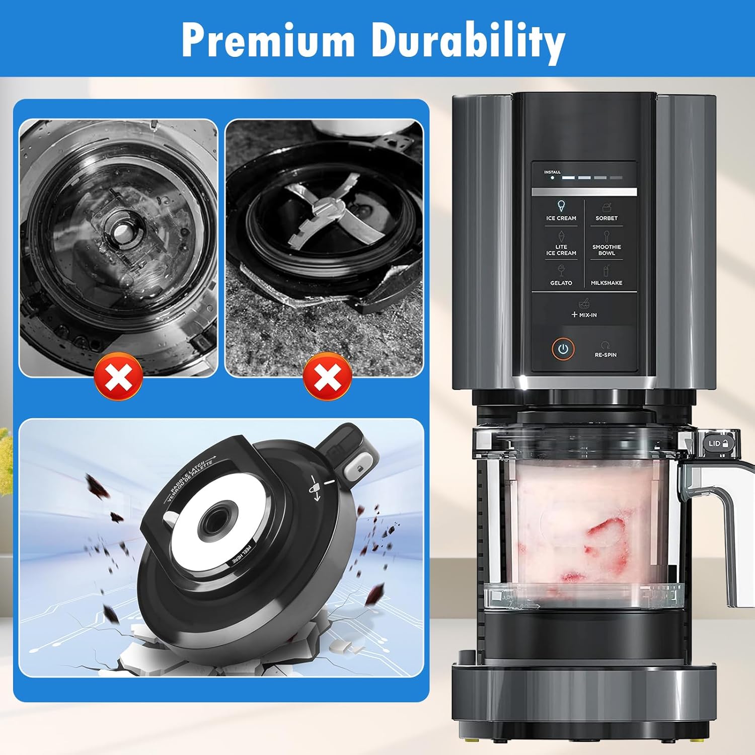 [Quick Installation]- Tool-free assembly within 10 seconds. The surface is smooth and not easy to leave food residues. (Note: Ice cream paddle not included)