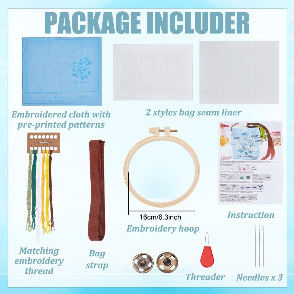 Embroidery Bag Making Kit: You will receive a complete set of embroidery material packages, including a blue embroidery fabric with printed flower, threads, needles, embroidery hoop and instruction, etc., allowing you to make a unique embroidery bag