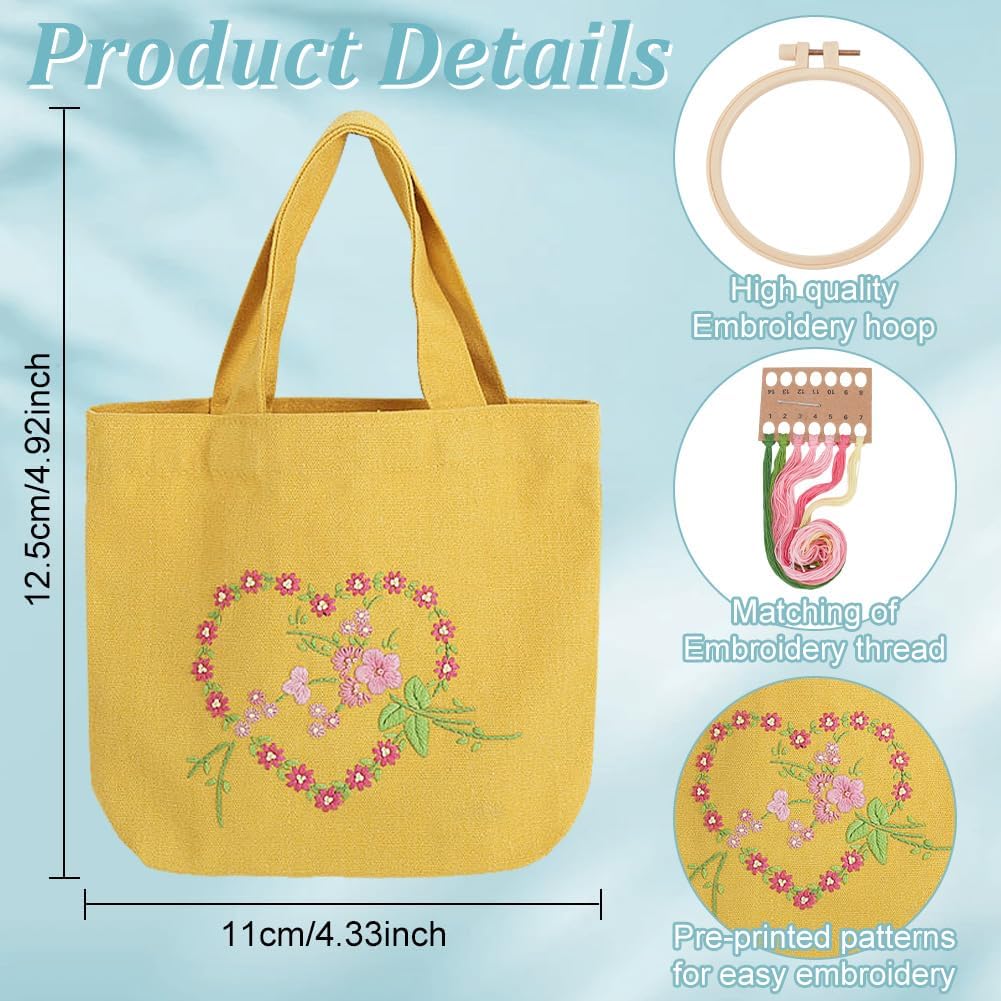 Embroidery Bag Making Kit: You will receive a complete set of embroidery material packages, including a yellow lunch bag with printed flower, threads, needles, embroidery hoop and instruction, etc., allowing you to make a beautiful embroidery bag