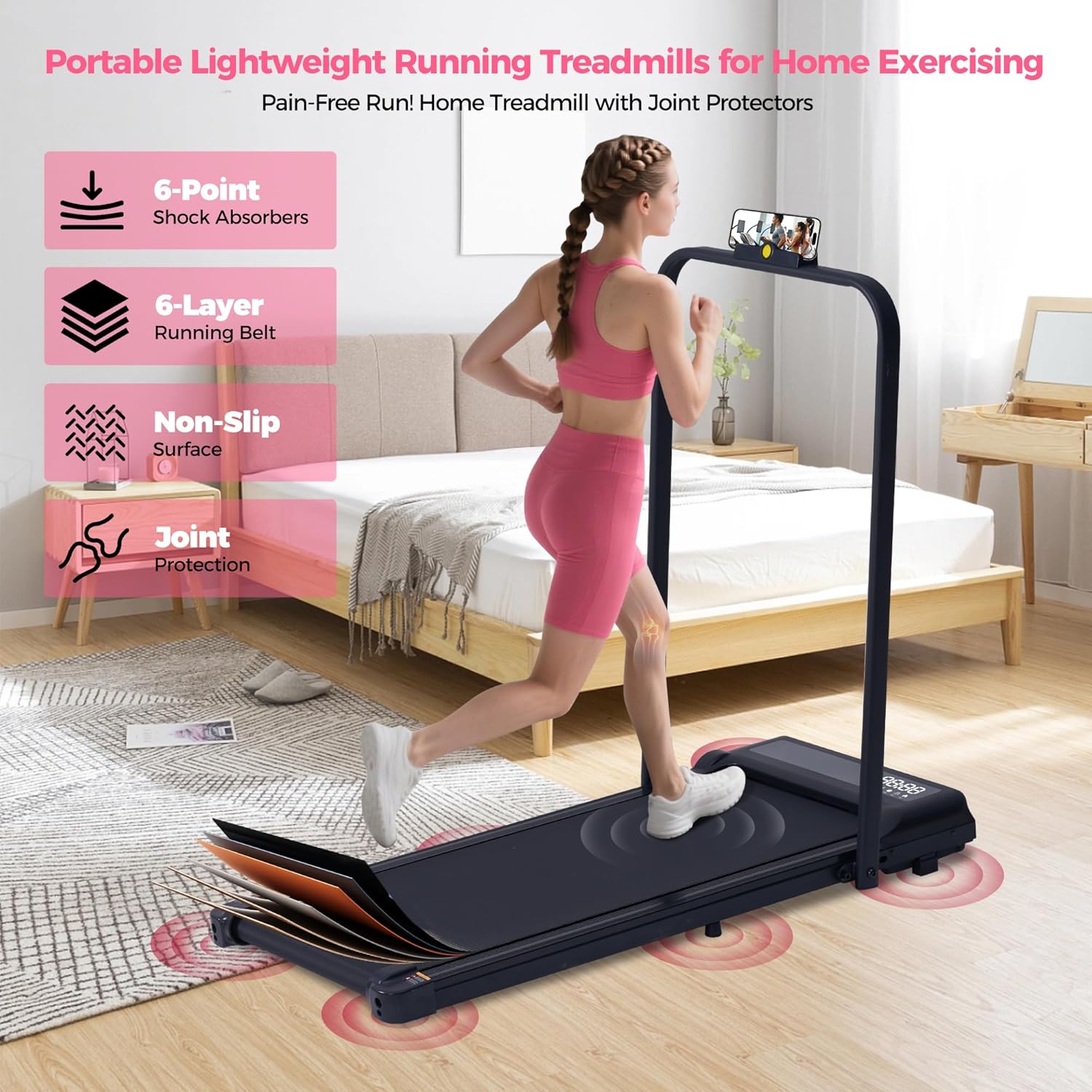 【Safety & Comfort for All Ages】This treadmill home small is designed with ergonomic handles to reduce hand fatigue and an advanced shock-absorption system that lessens joint strain. Ideal for walking pads treadmill and treadmills for home with 300 lbs weight capacity, it ensures comfort and safety during your walk or run.