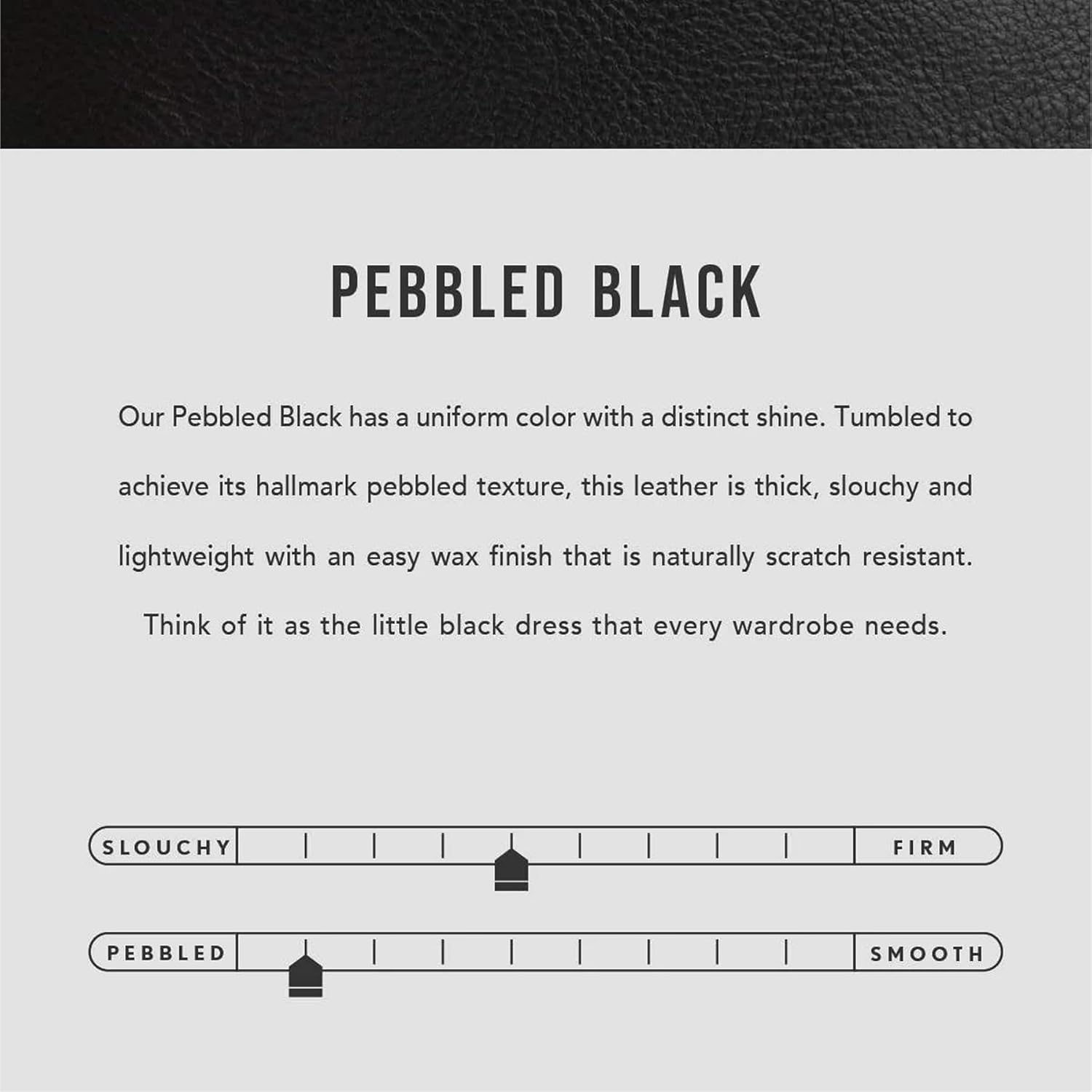 We use 4 types of leather: pebbled, smooth, brushed, & suede. Pebbled leather has a slouchier silhouette that is pebbled to the touch, smooth has a structured & sleek finish, brushed has an oil-rich smooth texture, & sueded has a velvety-soft finish.