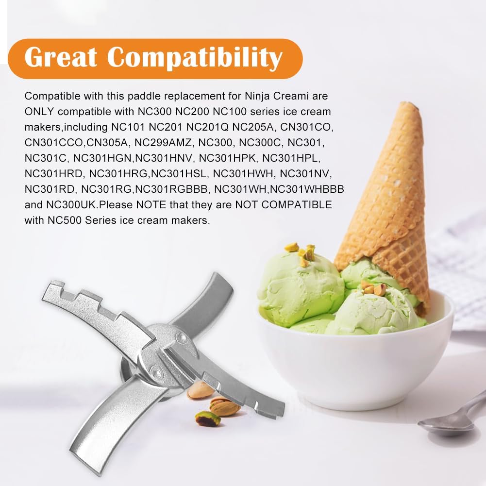 【Great Compatibility】Compatible with this paddle replacement for Ninja Creami are ONLY compatible with NC300 NC200 NC100 series ice cream makers, including NC101 NC201 NC201Q NC205A, CN301CO, CN301CCO, CN305A, NC299AMZ, NC300, NC300C, NC301, NC301C, NC301HGN, NC301HNV, NC301HPK, NC301HPL, NC301HRD, NC301HRG, NC301HSL, NC301HWH, NC301NV, NC301RD, NC301RG, NC301RGBBB, NC301WH, NC301WHBBB and NC300UK. Please NOTE that they are NOT COMPATIBLE with NC500 Series ice cream makers.