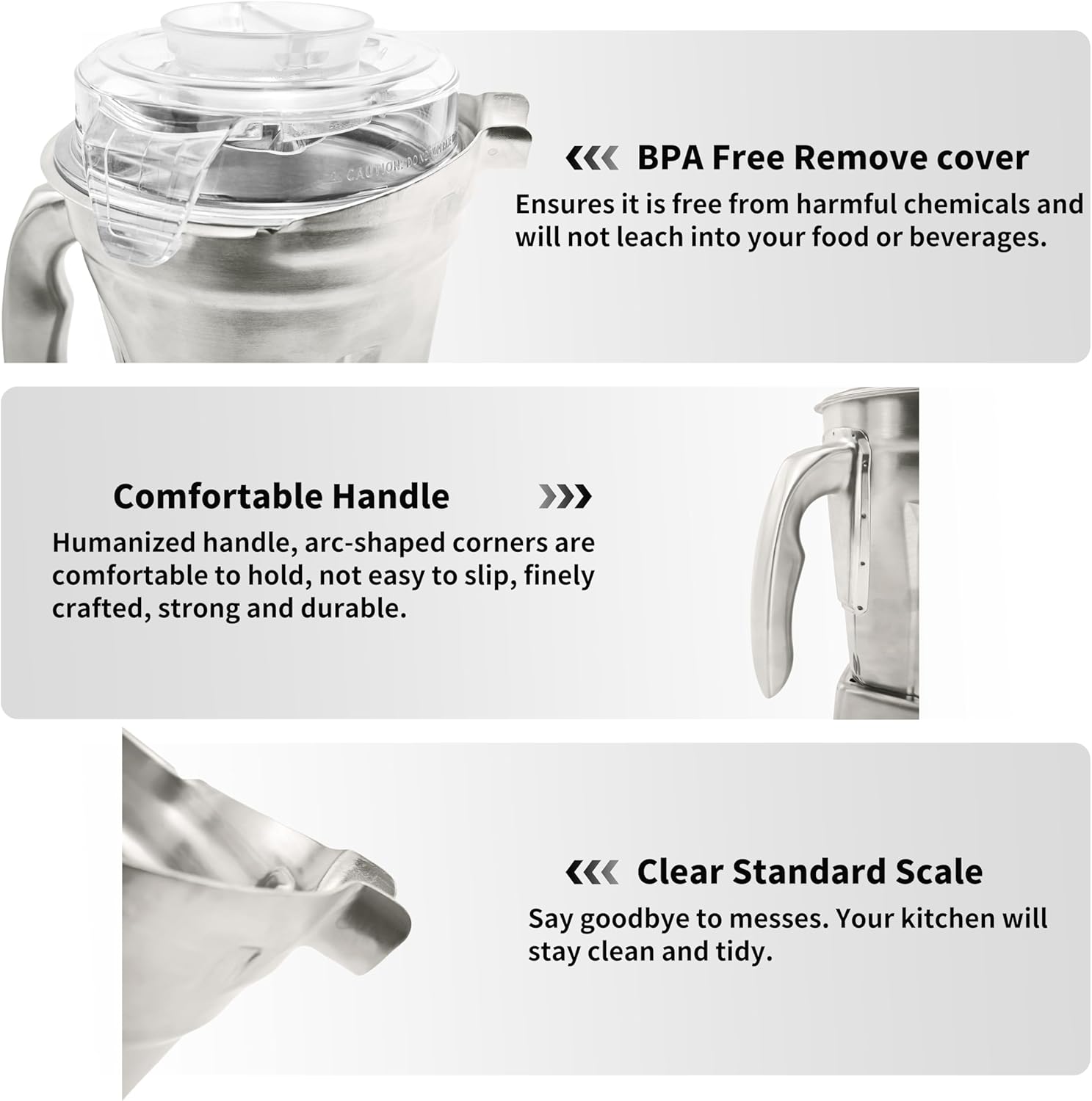 【Stain & Odor Resistant, Leak-Proof】 This replacement for vitamix stainless steel blender container is not only built to last but also features outstanding stain and odor resistance. It prevents lingering smells or discoloration from previous blends, ensuring each new blend is as fresh as the first. With a no-drip spout for precise and clean pouring, it eliminates mess and keeps your countertops tidy while enhancing your blending experience.