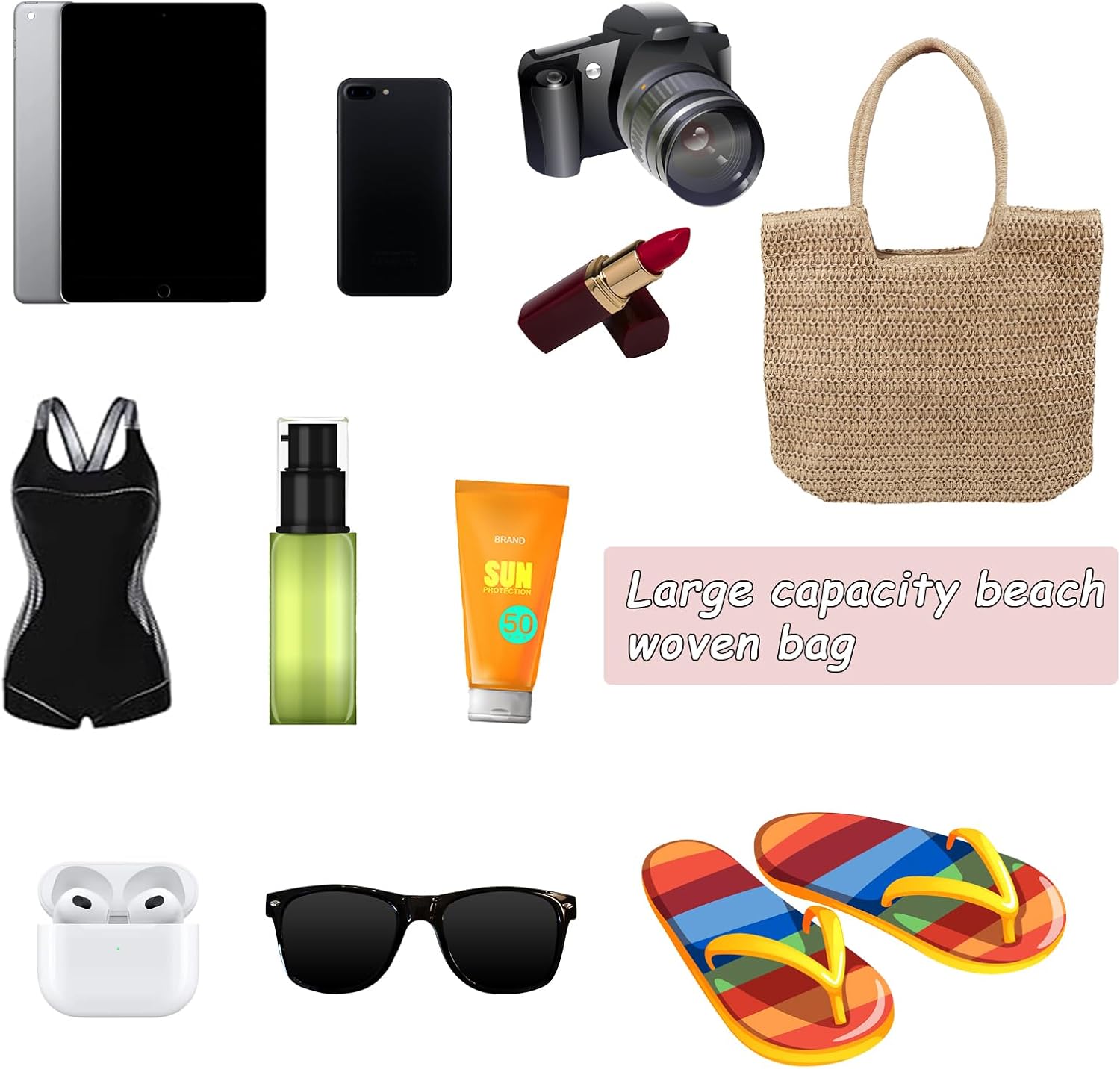 This straw beach bag is large enough to hold clothing, towels, sunglasses, cosmetics, books, cellphone, purses, food, etc. One inner pocket is convenient for storing cards, cash, and other small items.