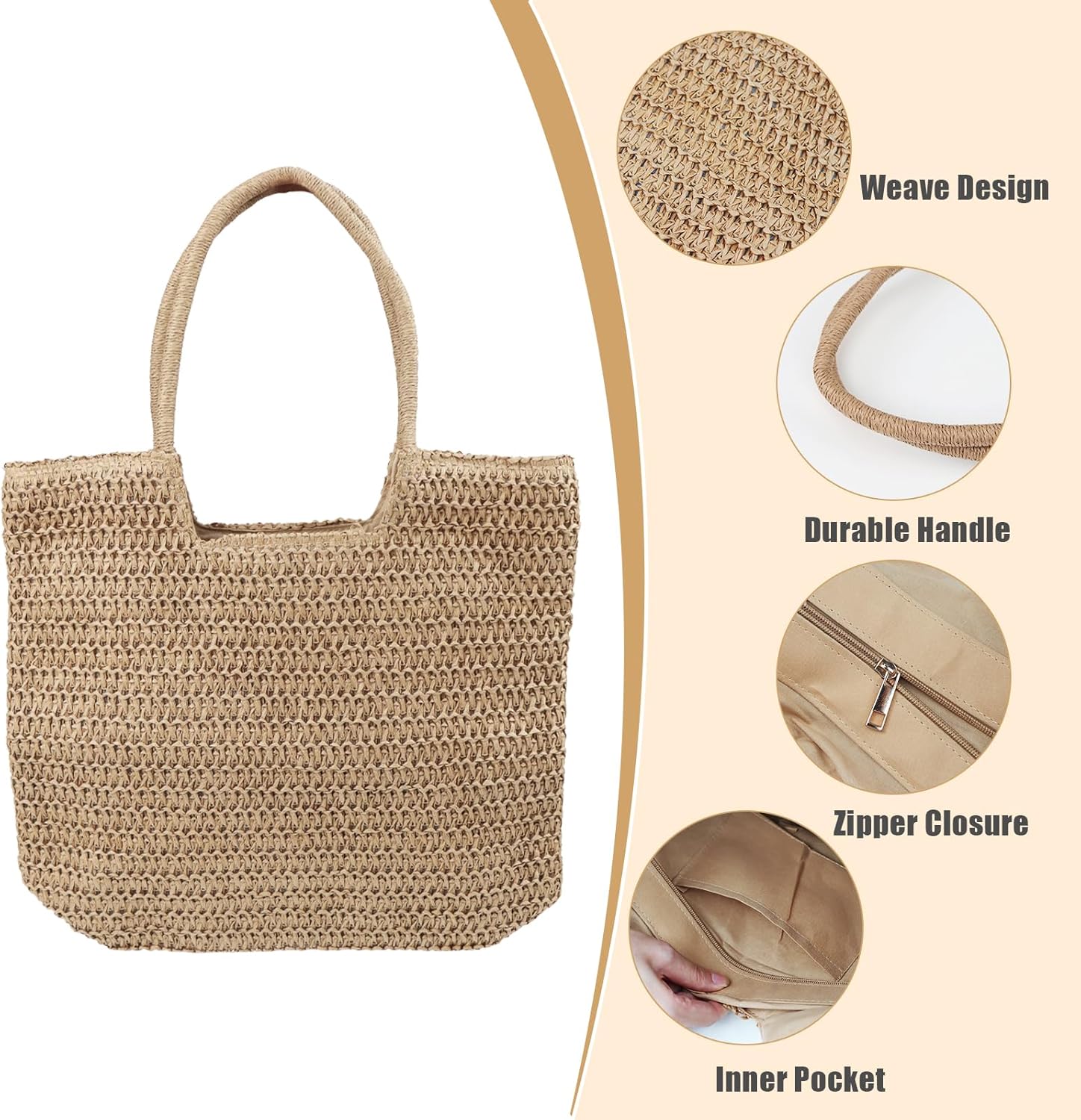 Straw Beach Tote Bag for Women,Summer Beach Bag Rattan Handbag,Large Khaki Woven Tote With Zipper for Holiday,Daily Use,Handmade Weaving Handbag.