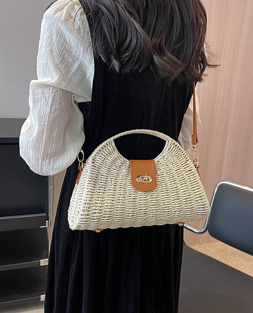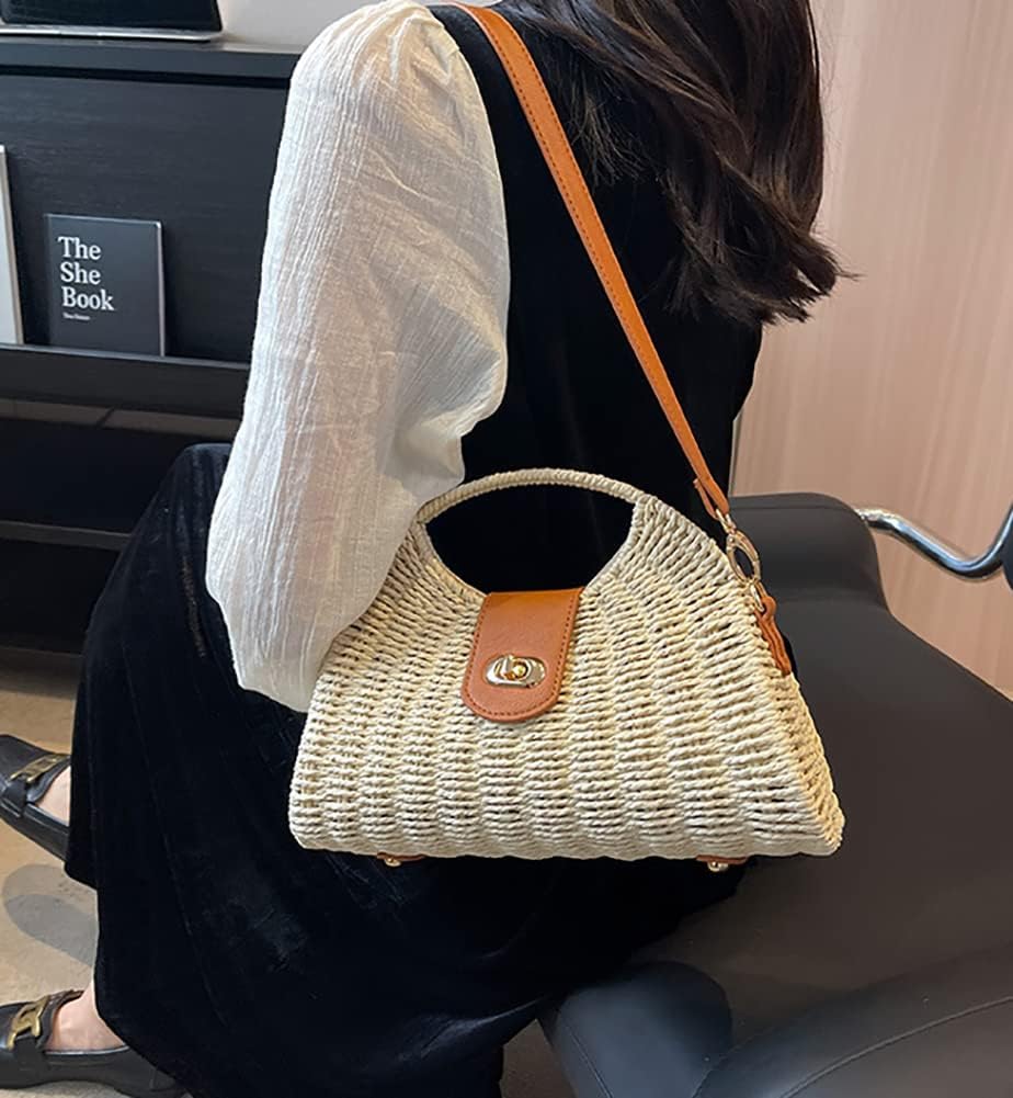 Perfect Size: 11.02″ x 6.30″x4.72″/ 28x16x12 cm (L x H x W). It has enough space for your stuff for travel and daily necessities such as wallet, glasses, cell phone, cosmetics, cards, MP3 player and other necessary things.Unique Design: The combination of rattan handles and semi circular straw bags is very innovative. Magnetic buckle closure, easy to open and close, protecting item safety. Cute handbag straw beach bag, practical and casual.Multi Purpose: The women’s shoulder bag combines popular aesthetic design, fashionable and charming, and can be used to match various styles of clothing.