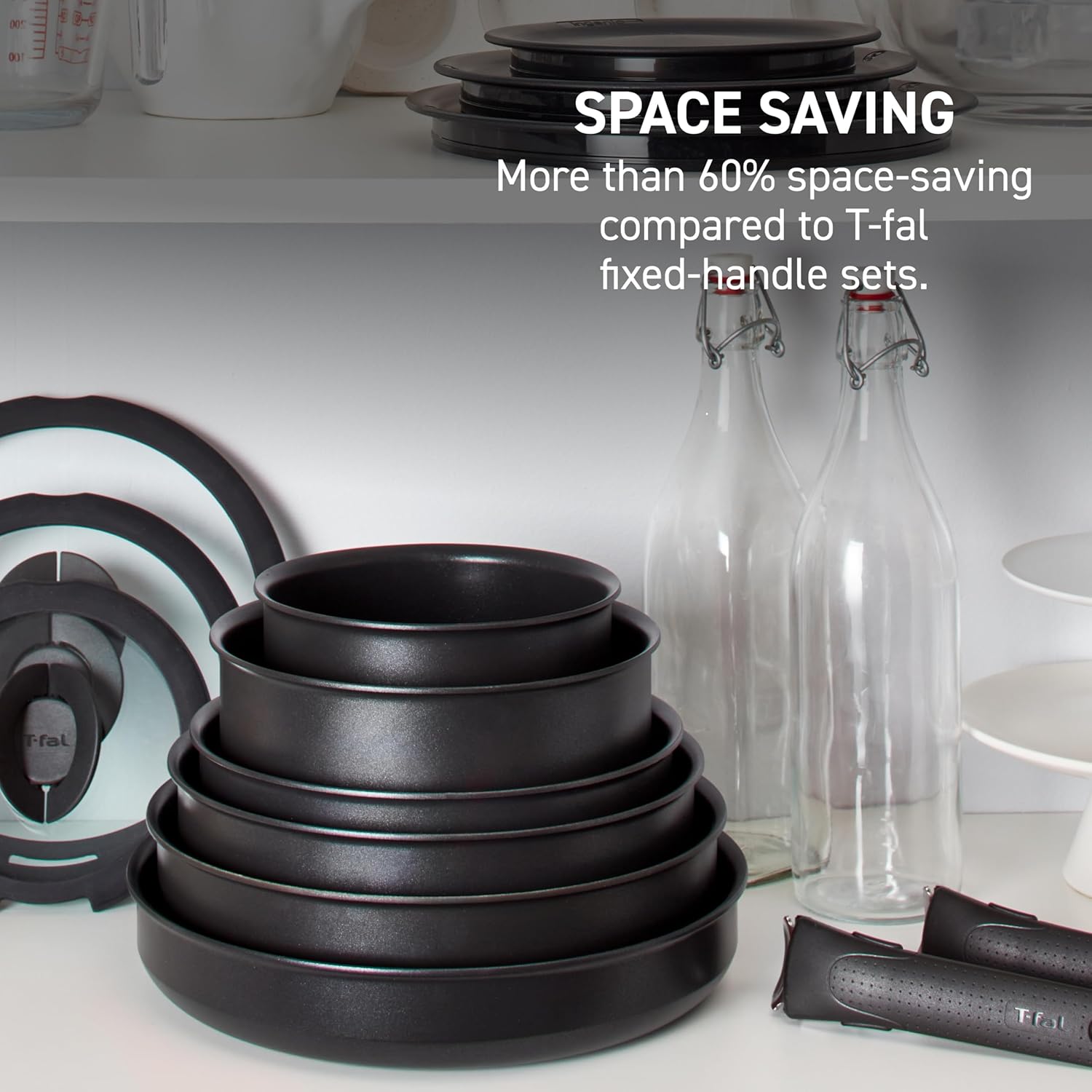 ๐Œ๐š๐ฑ๐ข๐ฆ๐ข๐ณ๐ž ๐˜๐จ๐ฎ๐ซ ๐’๐ก๐ž๐ฅ๐Ÿ ๐’๐ฉ๐š๐œ๐ž: Gift the joy of space efficiency! Stackable design saves up to 60% more space compared to T-fal fixed handle sets. This all-in-one set for cooking, baking, and serving is best for small kitchens, RVs, and other limited spaces.