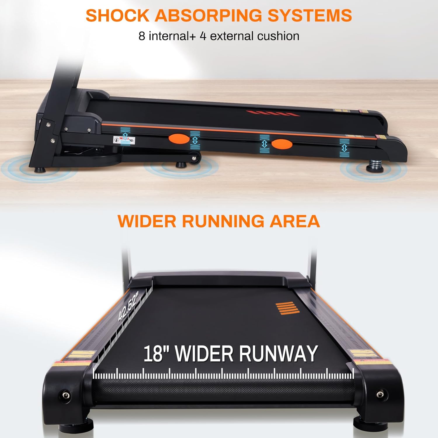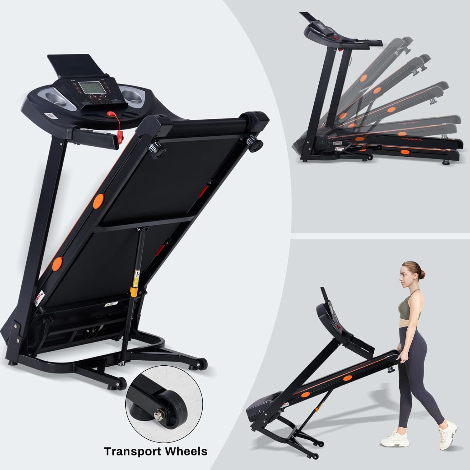 【Foldable Design with Hydraulic Soft Drop】This folding treadmill arrives 90% pre-assembled and features a hydraulic soft-drop system for safe and effortless folding. Built-in transport wheels make it easy to move and store, making it the perfect foldable treadmill for home use in apartments or compact spaces.