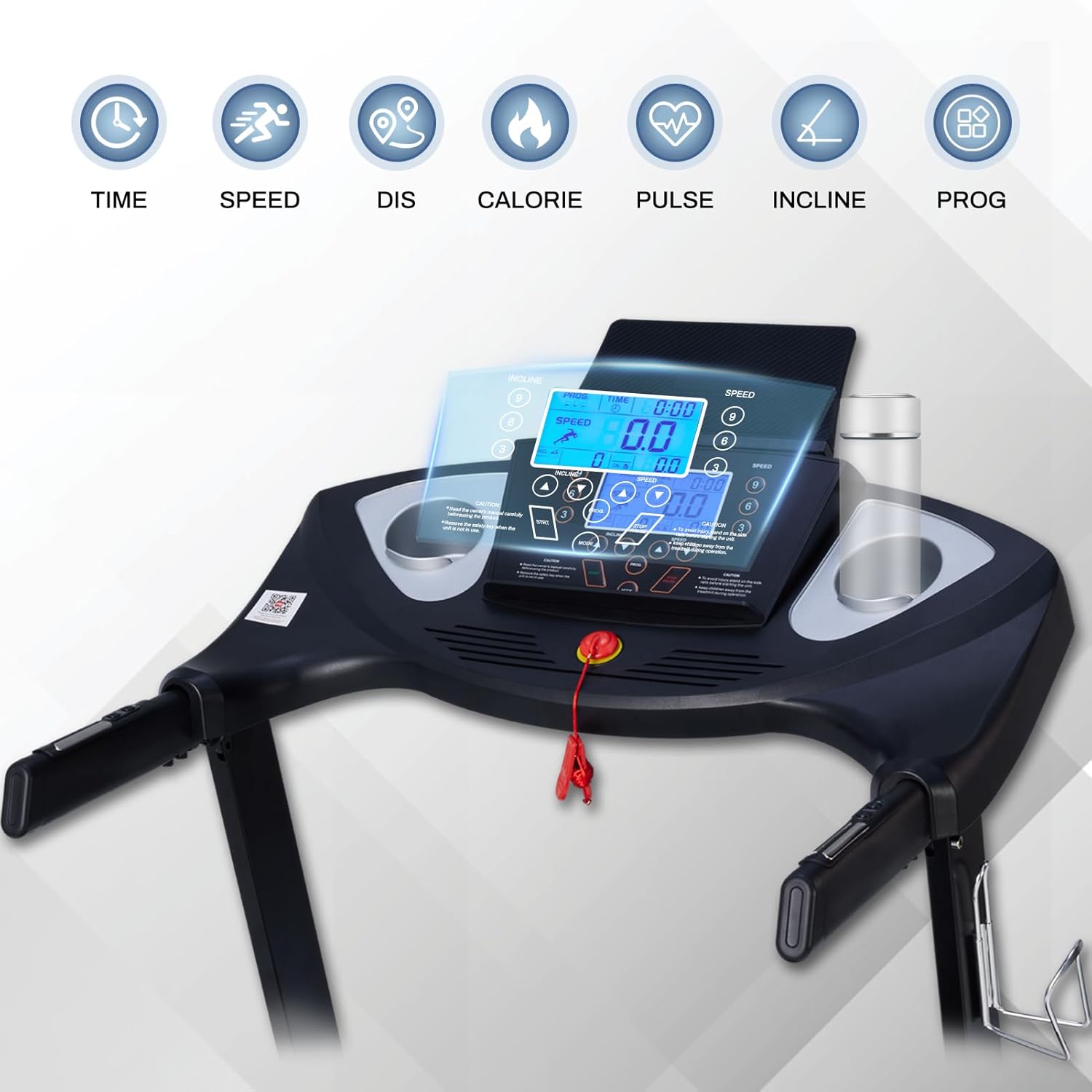 【Multi-Function LCD Display & 24 Preset Programs】Track your stats in real-time, including Time, Speed, Distance, Calories, and Pulse. With 24 preset workout programs, this treadmill for home makes it easy to tailor training for fat-burning, cardio, or endurance. Quick-access buttons provide smooth control of speed and incline.