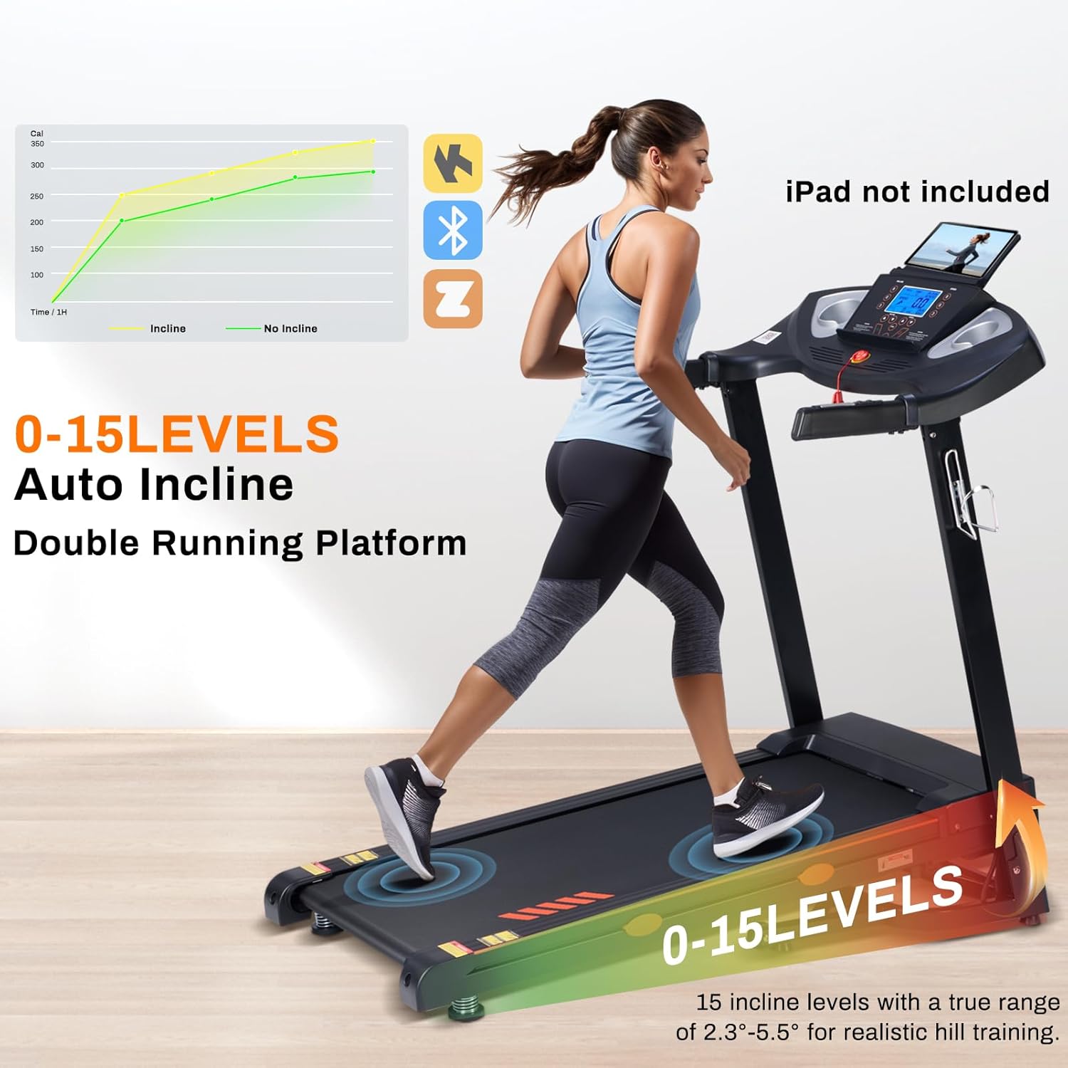 Treadmill with 15-Level Auto Incline, 3.0 HP Treadmills for Home with 18″ Wide Running Belt, 0.5-10 MPH Speed, 300 LB Capacity, Shock Absorption, App Bluetooth
