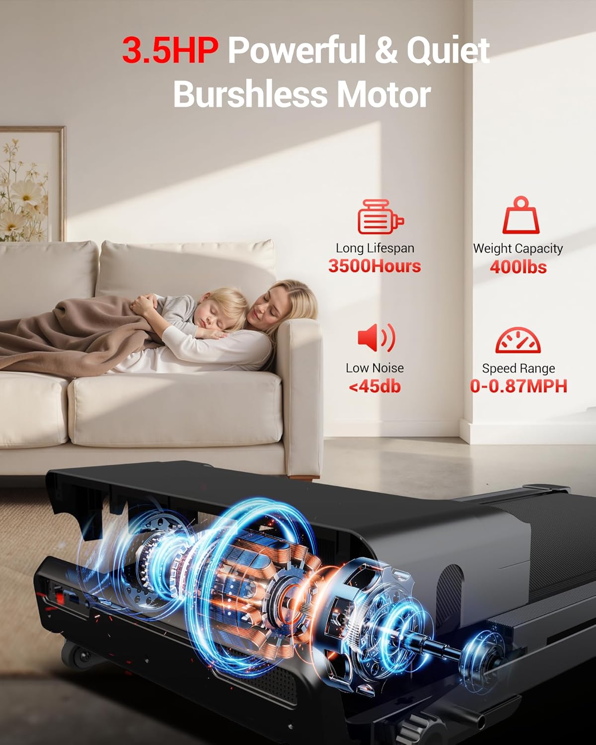 400 lb Capacity Treadmill + 3.5HP Quiet Motor: Heavy duty treadmill 400 lb capacity with commercial-grade brushless motor (<45dB). Lasts 3500+ hours, 0-8.7 MPH speed.