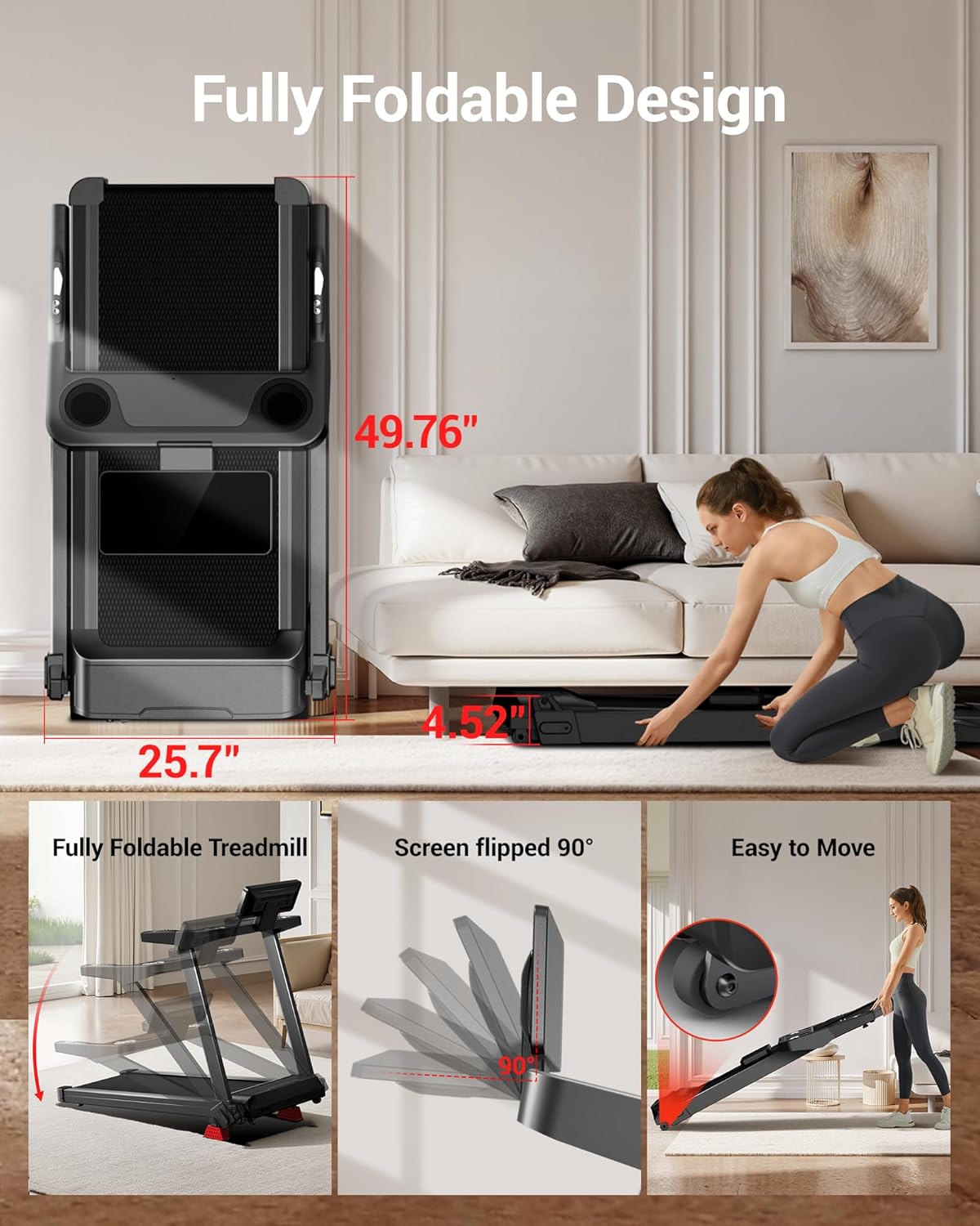 Foldable Treadmill w/Wheels for Small Spaces: Fully folding treadmill collapses from 50″L x 25″W x 47″H to 50″L x 26″W x 4.5″H (head folds 90°). Portable treadmills small space solution with transport wheels.