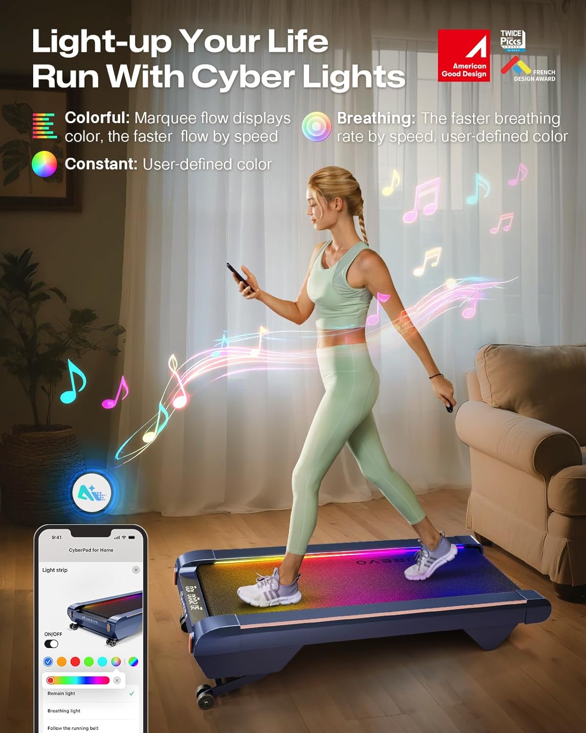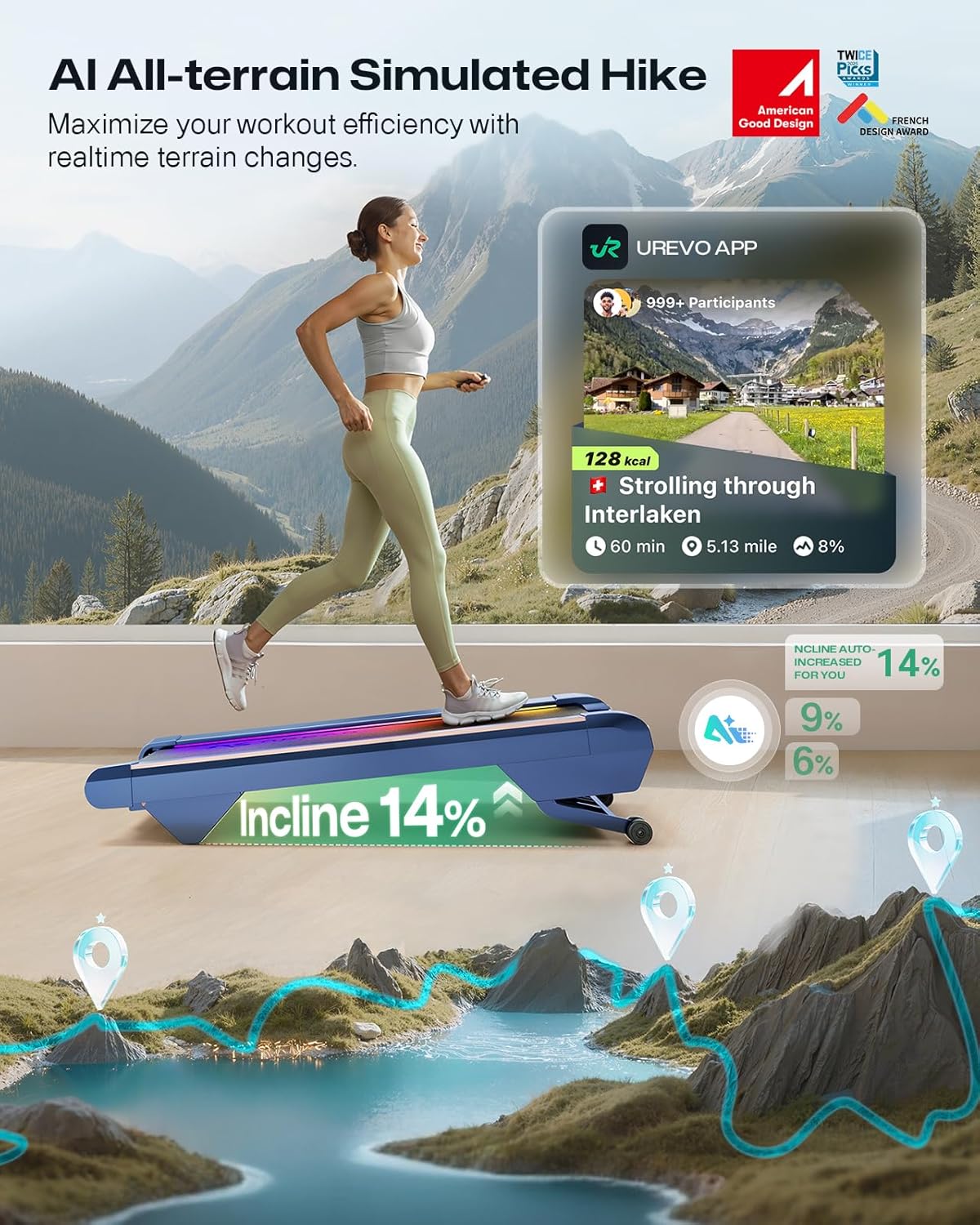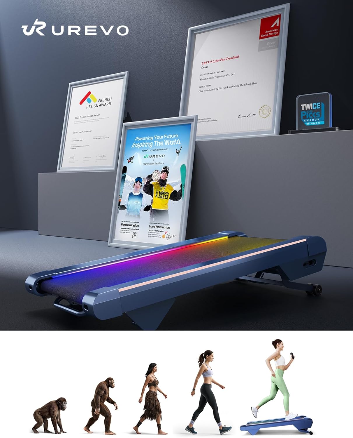 UREVO CyberPad Smart Walking Pad with 14% Incline, Under Desk Treadmill for Home Use, Extended Walking Surface, LED Remote, Speed-Responsive Lighting, Quiet Brushless Motorized, UREVO APP