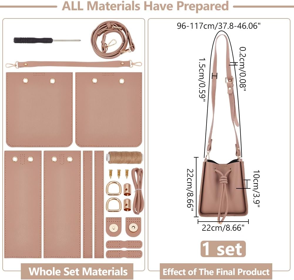 Packing Including: You will receive 1 set of DIY imitation leather sewing bucket bag making kit, including 8pcs leather material, 2pcs D Rings, 1pcs screwdriver, 1 roll of suture, 2pcs needles, 8pcs screws, 3pcs screws, total 25 pieces, have been cut and drilled in advance, complete with accessories and sewing tools, come and start to making a beautiful bucket bag