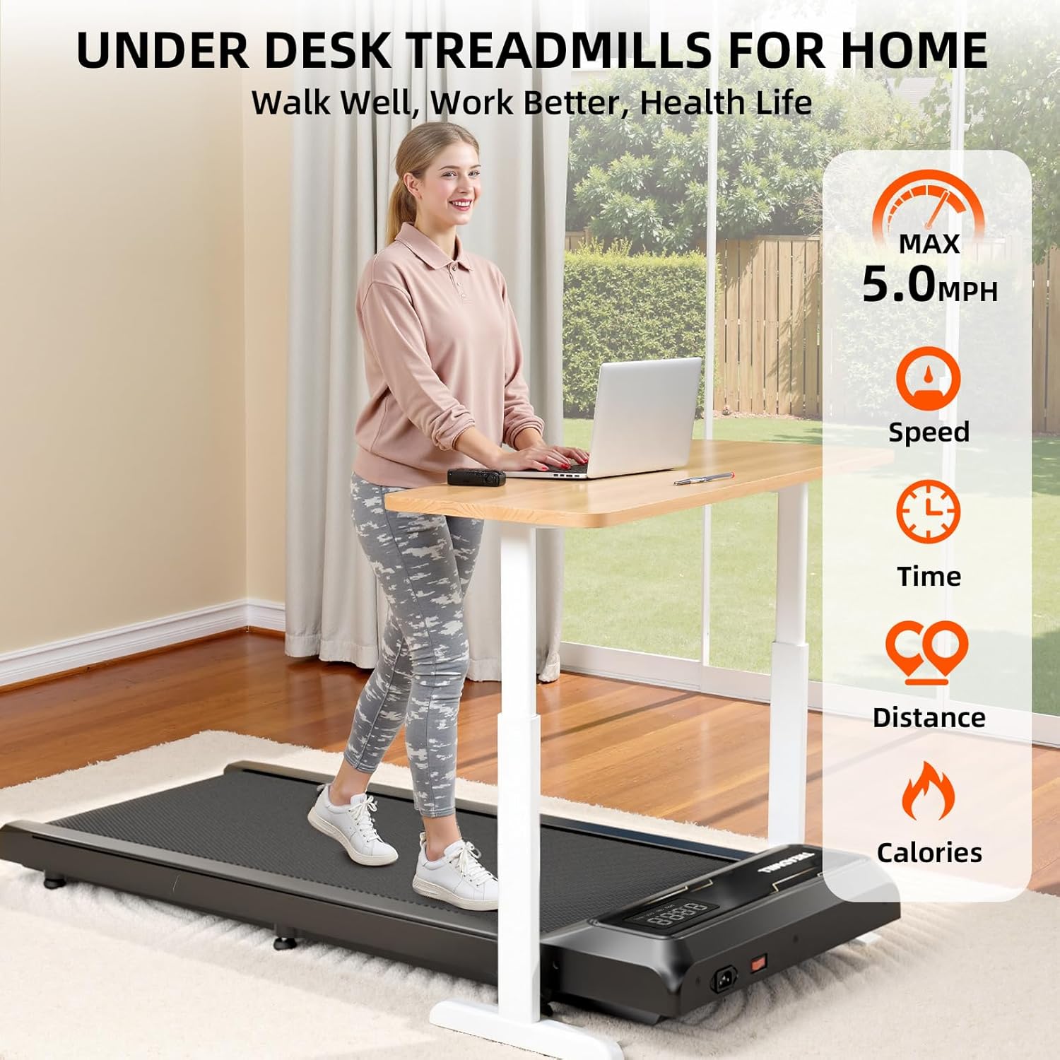 LED Display and Remote Control: Featured with a clear LED display, this desk treadmill tracks and shows your speed, time, distance and calories in real time. With the included remote, you can easily adjust settings without interrupting your run, making your workout both smart and hassle-free