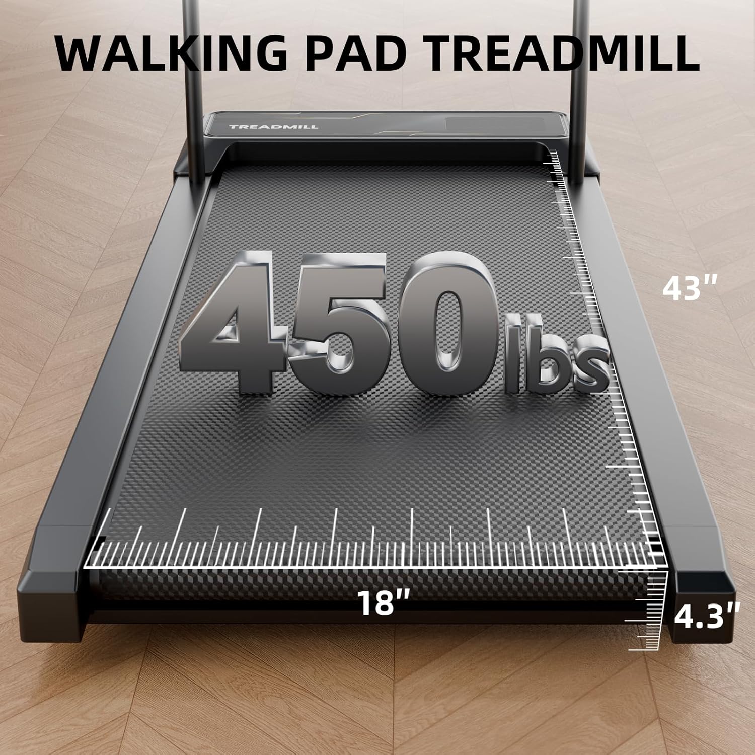 4-in-1 Walking Pad Treadmill for Home: this walking pad with handle bar supports working, walking, jogging and running workouts. The speed range from 1 to 5 MPH offers smooth transitions between modes, 15000 hours service life, fit for home, office or gym, so you can stay active anytime without switching equipment