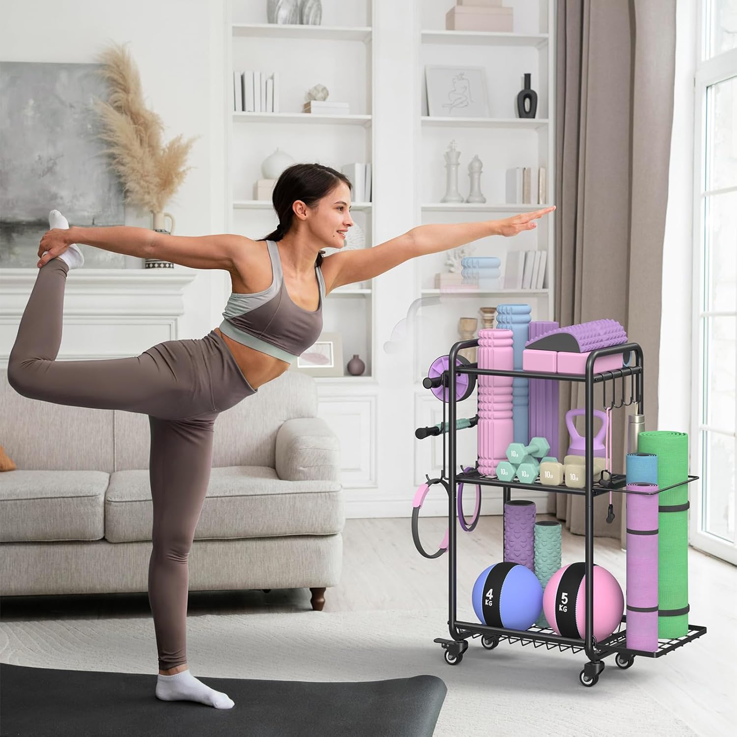 UPGRADED WHEELS & ACCESSORY HOOKS: This fitness equipment organizer comes with 4 smooth-rolling wheels (including 2 locking ones), making it easy to maneuver around your home. Additionally, the integrated, removable hooks on both sides offer extra space for hanging towels, ab rollers, resistance bands, yoga straps, and other home gym essentials