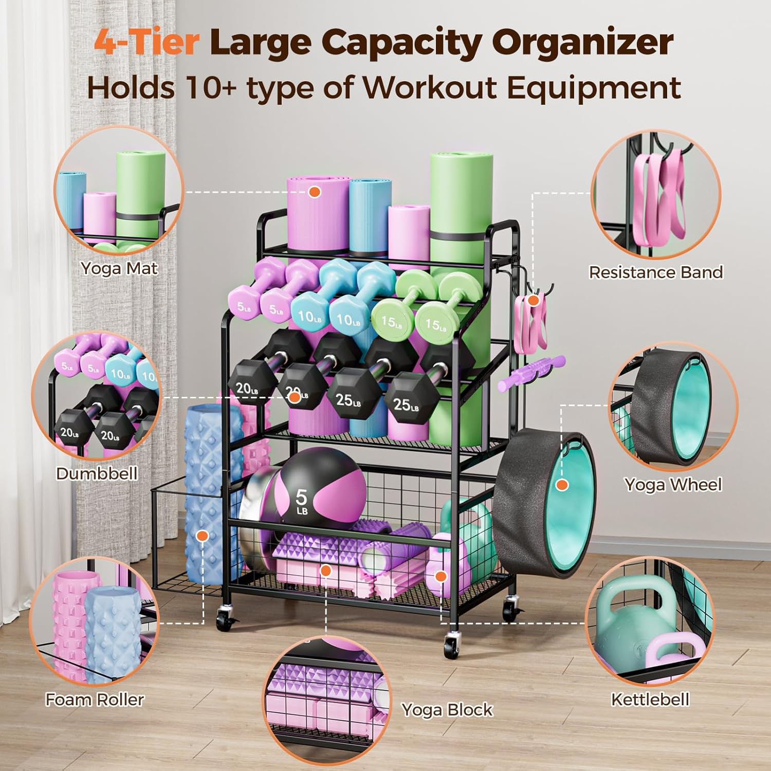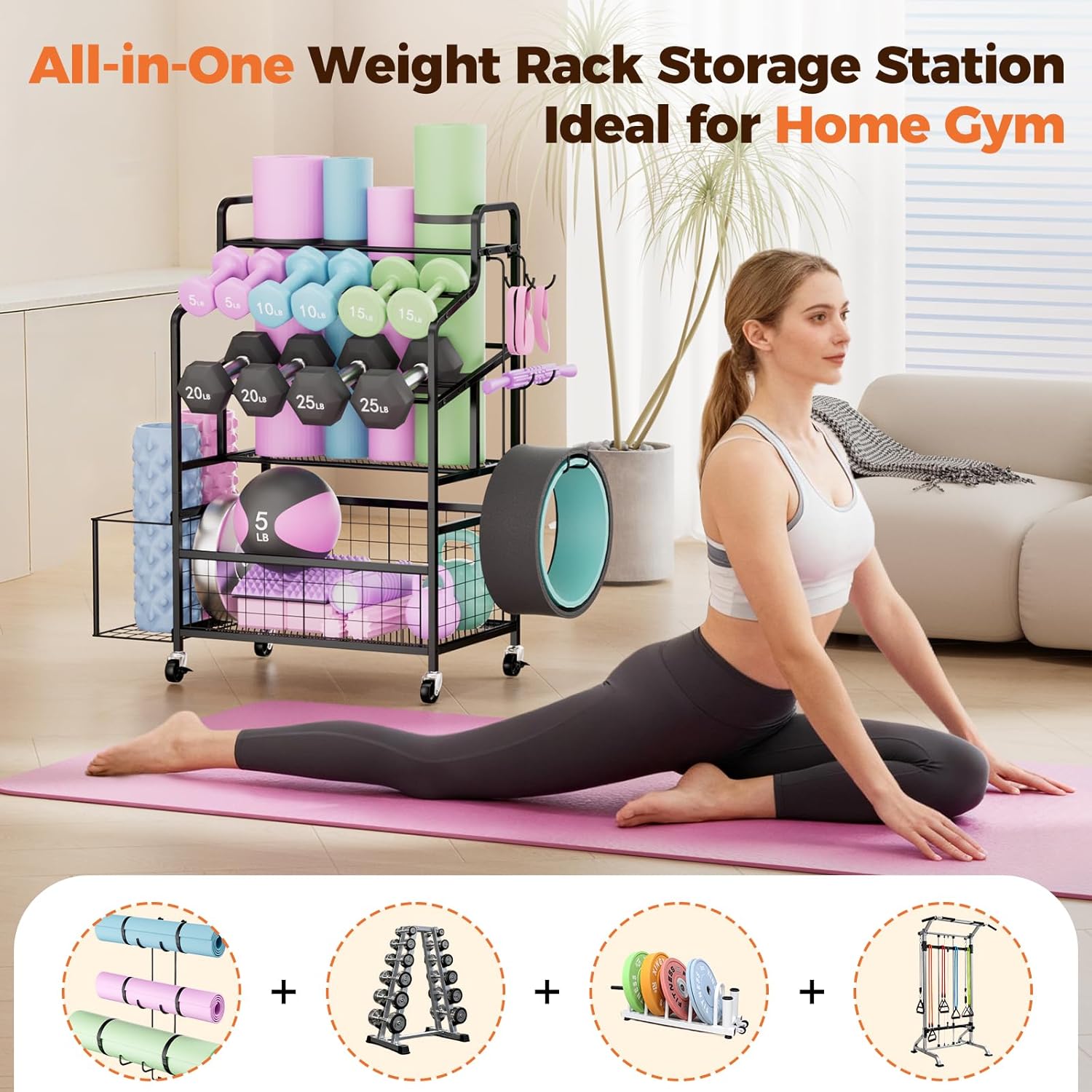 【All-in-One Organization】Dedicated holders for resistance bands,gear,yoga mats and foam rollers. Tiered shelves plus hooks for all essentials – weights, dumbbells, kettlebells in one space-saving rack