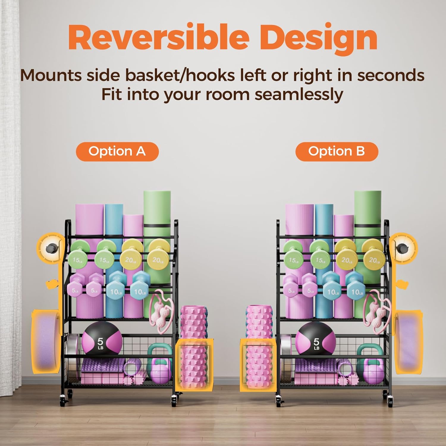 【4-Tier Switchable Design】Mounts side basket left or right in seconds.Carries yoga mats and foam rollers with ease.Customize and optimize your space