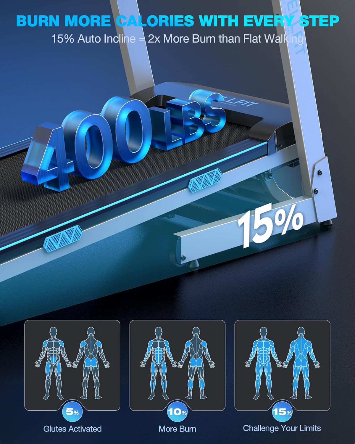 【15% Auto Incline – Burn More in Less Time】Upgrade your cardio with an incline treadmill that boosts calorie burn up to 2X. The 0–15% auto incline simulates uphill terrain for fat-burning, endurance, and strength training—without disturbing your household.