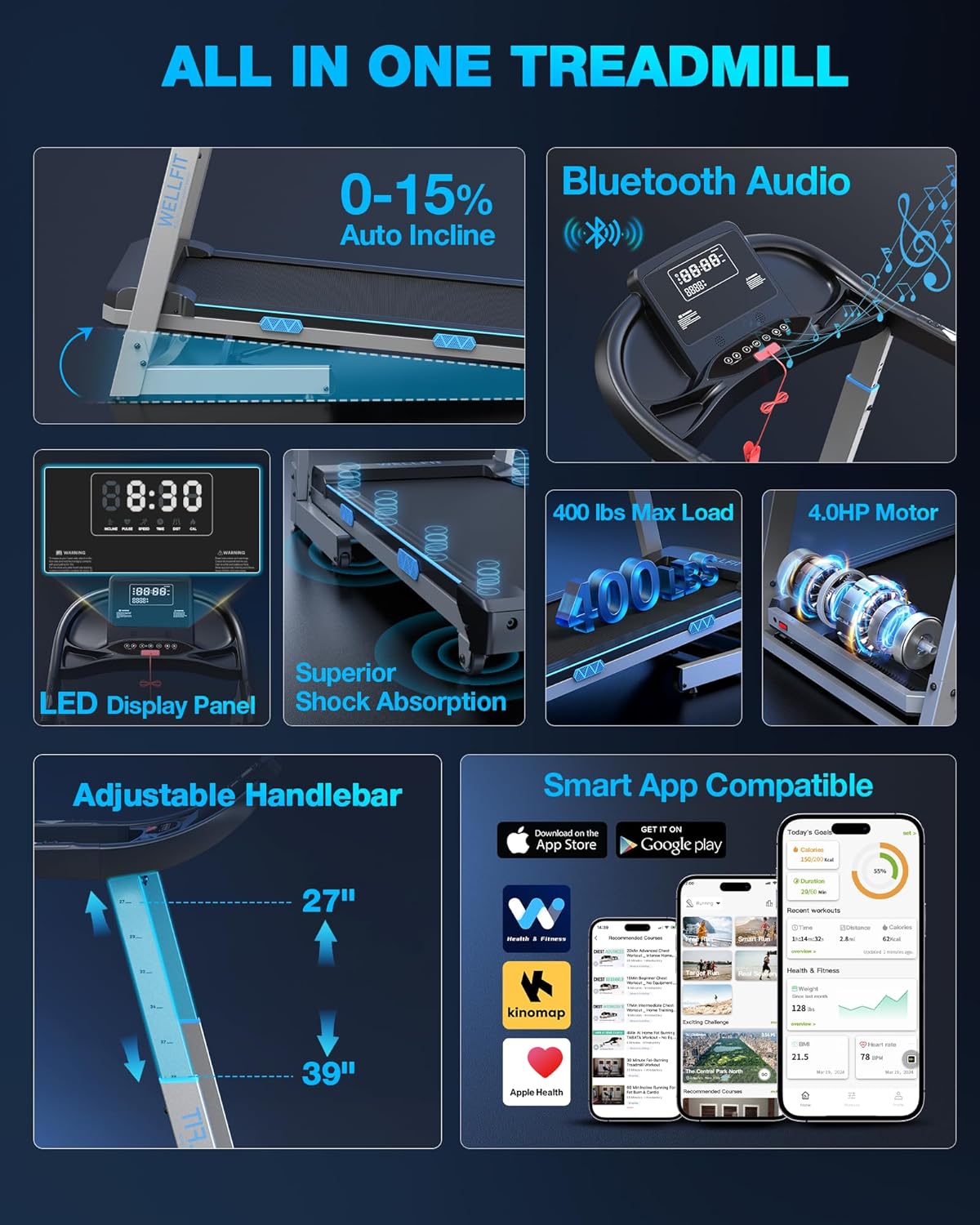 【App-Connected Smart Treadmill】Turn indoor running into an outdoor adventure! Sync with WELLFIT, KINOMAP & Apple Health to track real-time stats, set fitness goals, and enjoy immersive workouts. A compact treadmill for apartment use with pro-level training features.