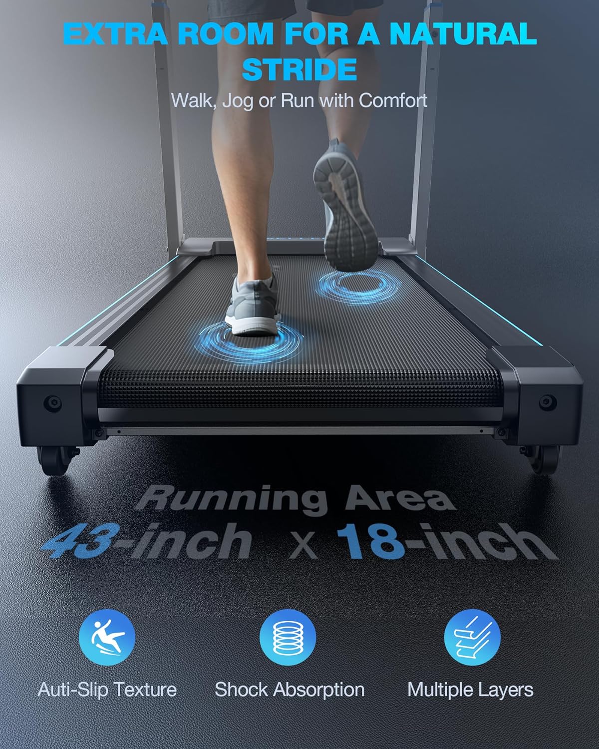 【Joint-Friendly Cushioning Deck – Protect Your Knees】Run safer and longer with WELLFIT’s shock-absorbing running belt(running area: 43-inch x 18-inch). The cushioned deck reduces impact on knees and joints, making it ideal for seniors, beginners, and anyone needing a low-impact treadmill workout.