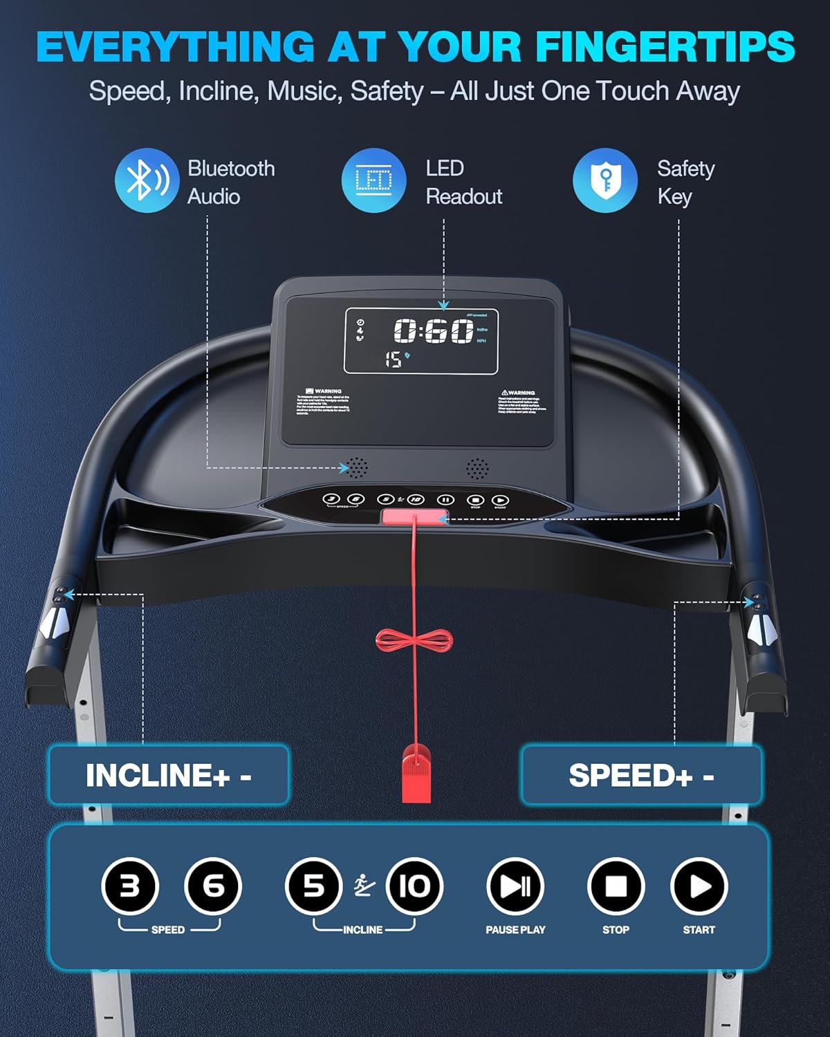 【LED Display & Safety Protection】Stay informed with speed, time, distance, calories, heart rate & incline on the clear LED console. Built-in safety key stops instantly for protection, while the heart rate sensors track intensity for safe, optimized training.
