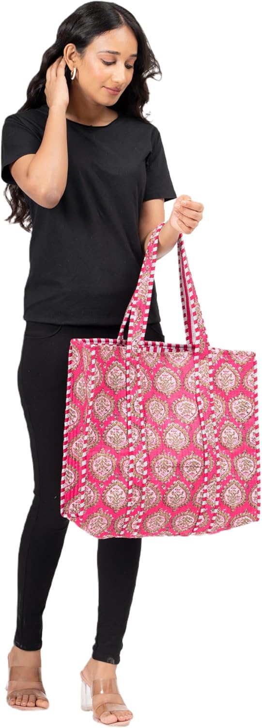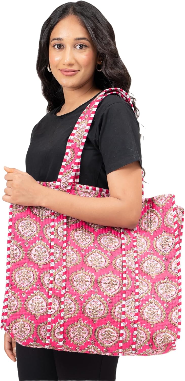 Women’s Unique Quilted Large Cotton Fabric Tote Bag Travel Grocery Shopping Weekend Trips with Inside Pocket