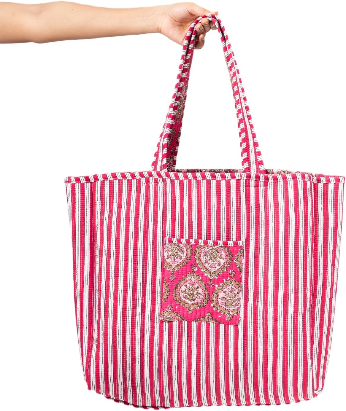 Elevate your style with this exquisite handmade, screen-printed, quilted tote bag crafted from 100% cotton. Perfect for travel, grocery shopping, beach trips, or everyday use, this spacious and washable bag offers both functionality and elegance.