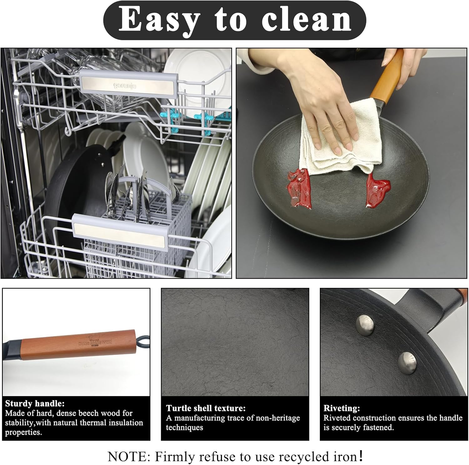 No Coating, Just Pure Iron – Durable, Scratch-Resistant Made from 100% virgin pig iron with no enamel or chemical coatings. Withstands high heat, and works well with metal utensils. Unlike coated pans, our cast iron omelette pan won’t peel or chip—it’s scratch-resistant ironware built to last generations, just like a traditional wok in a Chinese home