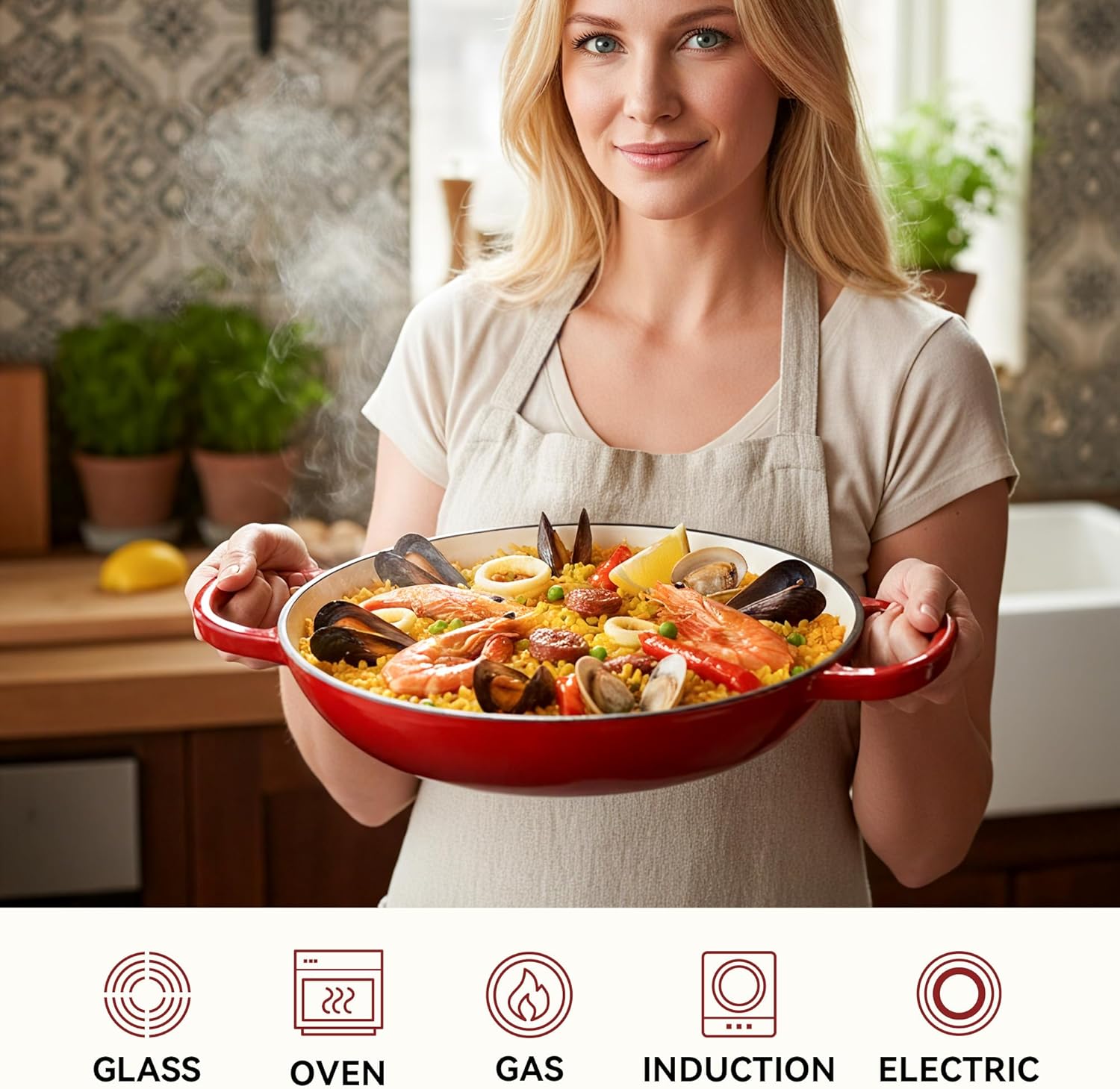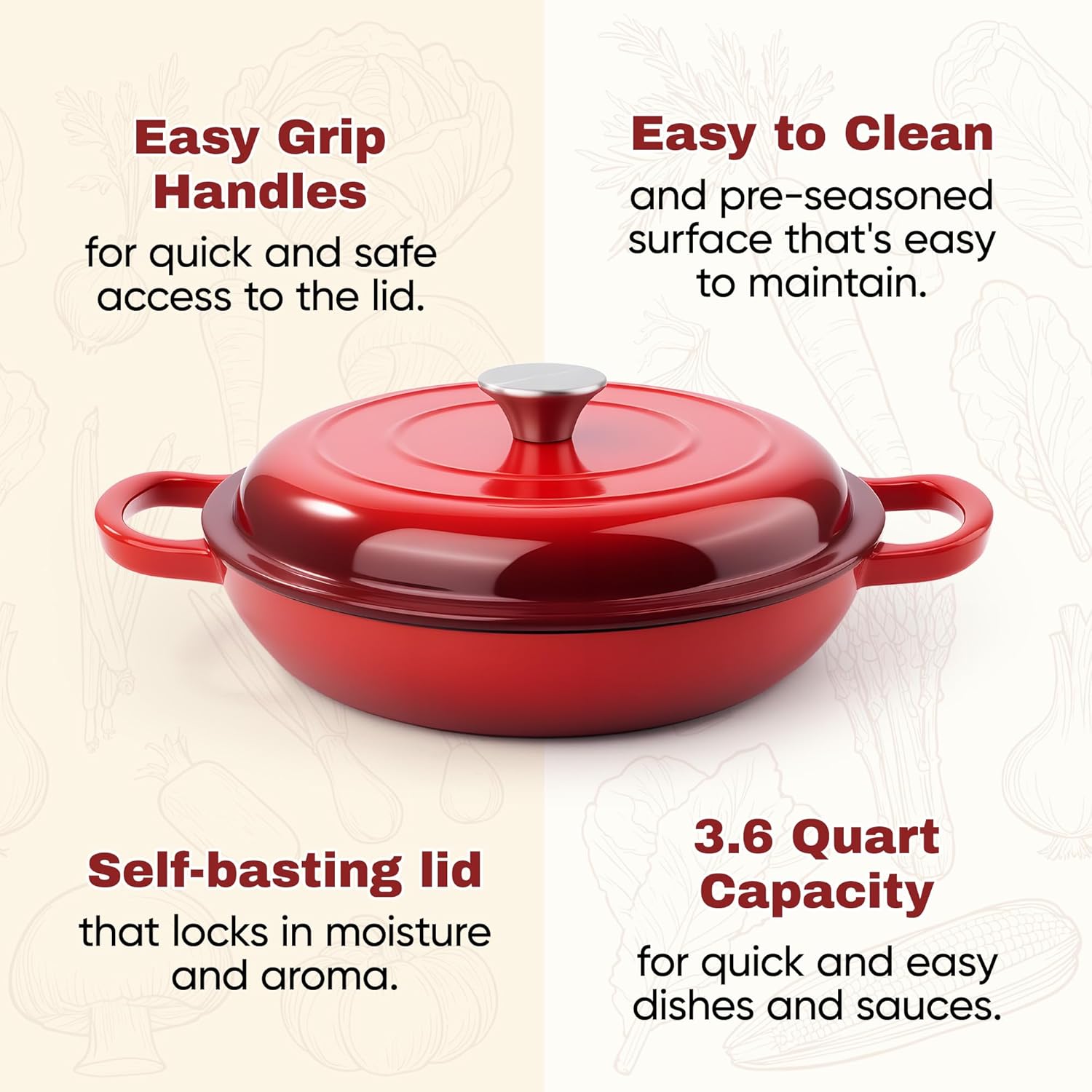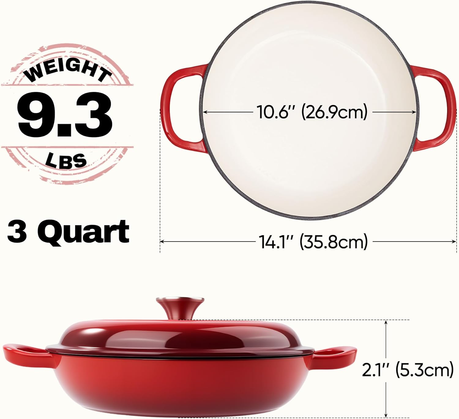 3 Quart Enameled Cast Iron Braiser, Non Stick Enameled Cast Iron Skillet with Lid, Dutch Oven Skillet with lid up to 500°F for Oven, Stove, Grill, Shallow Dutch Oven for Cook, Bake (Red)