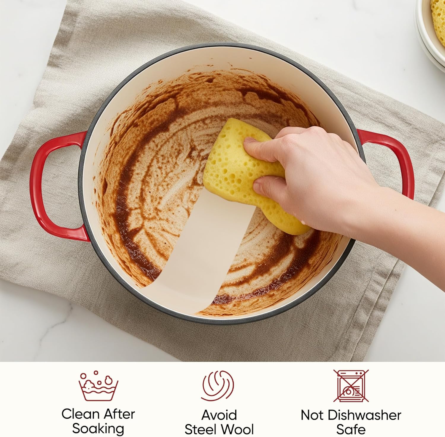 EASY TO CLEAN: This Cast iron dutch oven has a non stick coating that makes it easy to clean with a soft sponge or cloth when encountering any stains. If you want to remove difficult stains in pots, you can soak them in warm water for 1 to 2 hours or longer, and then clean them with baking soda or neutral detergent.