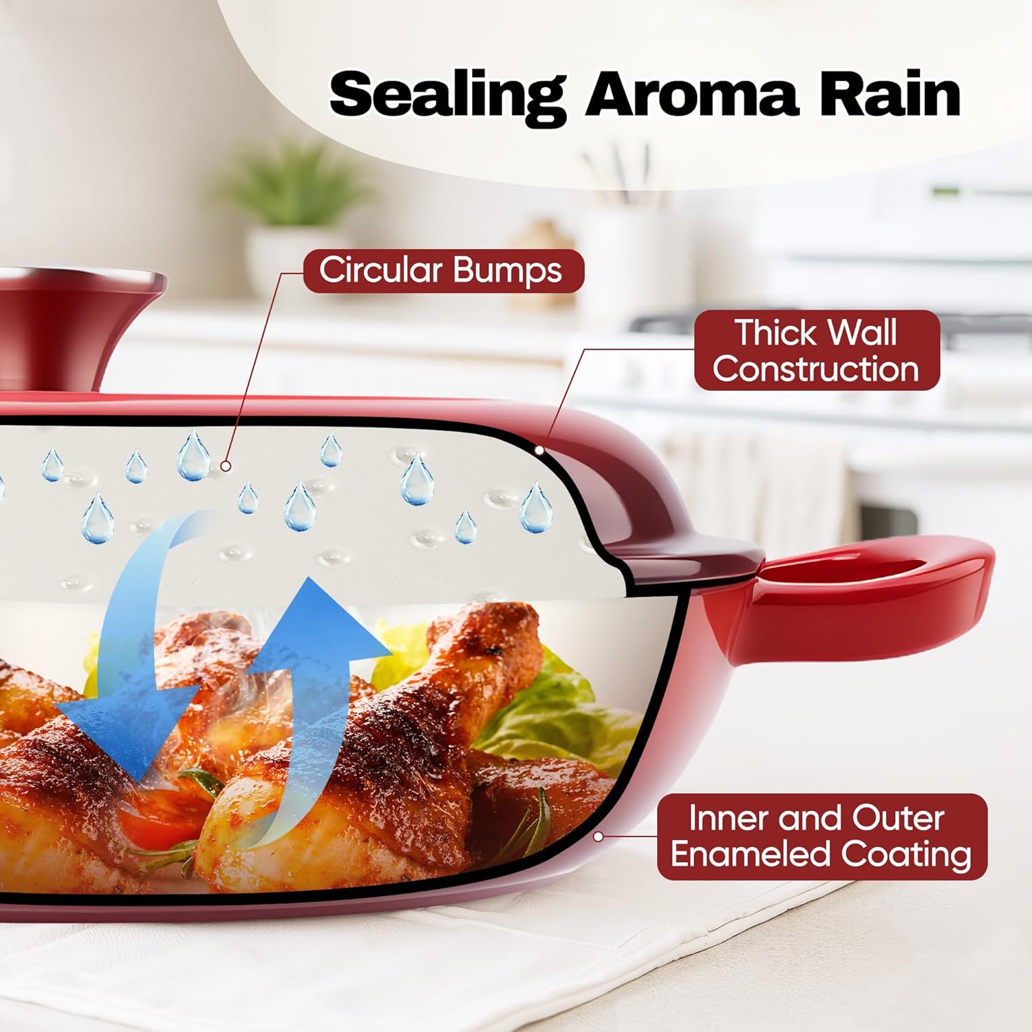 PREMIUM MATERIAL: This Cast iron dutch oven made of high-quality cast iron core, coated with food grade enamel coating; Durable and sturdy structure, the cast iron core achieves even heat distribution, maximizing the preservation of the original nutrition and taste of the food
