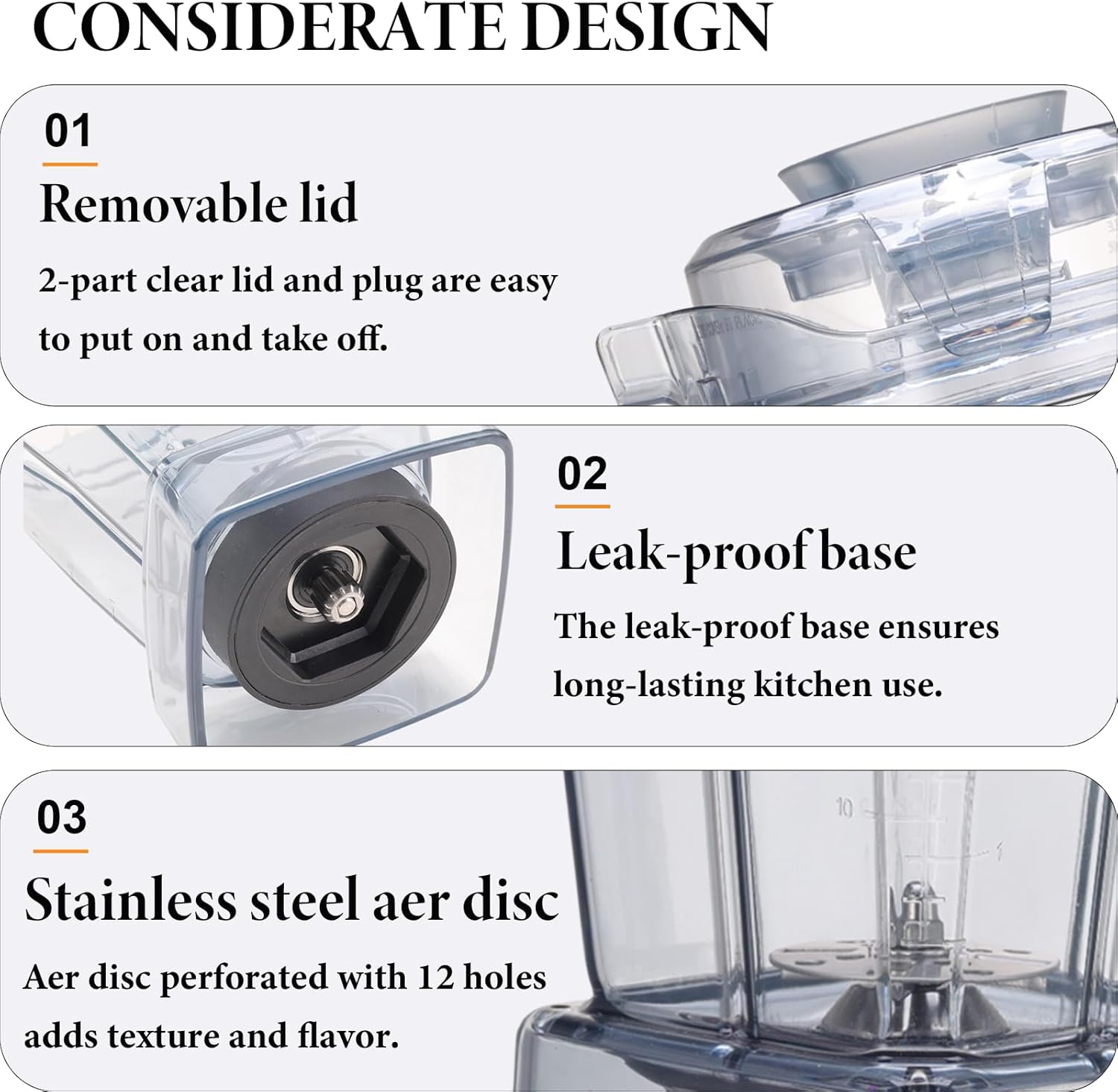 【Rust and Leakage】 Our 48oz Aer Disc blender pitcher features NMB bearings and FYC oil seals to prevent rust and leakage during use. This ensures the replacement pitcher performs better and lasts longer. It’s an excellent choice, compatible with vitamix replacement pitcher, offering enhanced performance and durability
