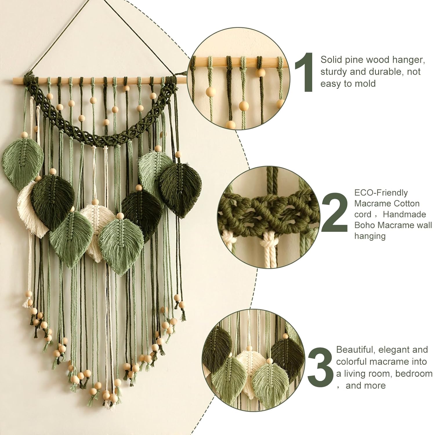 【High-Quality Material】- Our macrame wall art is handcrafted cotton cords, ensuring a clean and soft texture. 10 Macrame Leaf Wall Hanging with wood poles and wood beads as decoration, highly durable, sturdy and stable. This bohemian home decor is perfect for your family