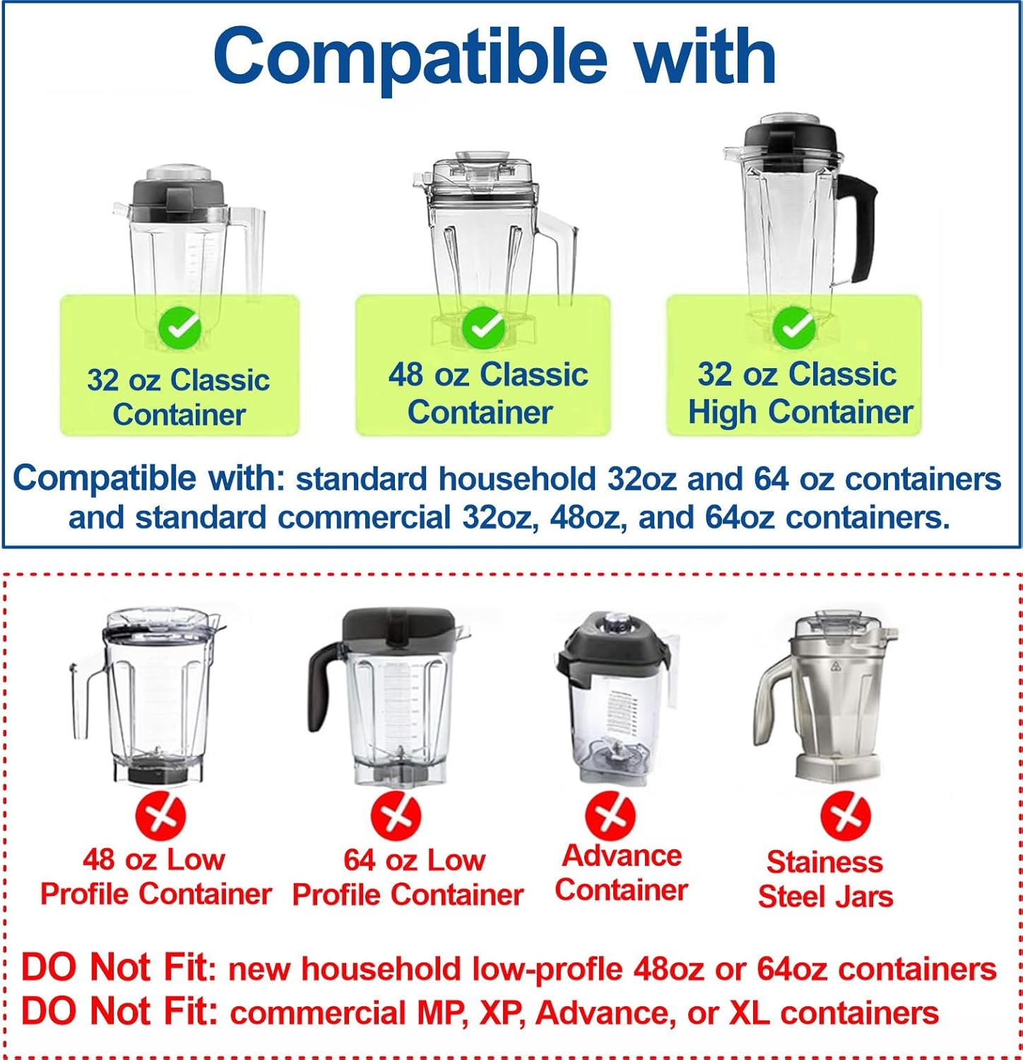 PLEASE NOTE: This product is not compatible with Vitamix NEW low-profile 64 oz or 48 oz household containers, or commercial MP, XP, Advance, or XL containers. Incompatible with Vitamix Model 750, 780, 5300, 6500, 7500, A2300, A2500, A3300, A3500, E310, E320. To ensure a perfect fit, kindly verify your blender model before purchasing. Contact us with any questions!