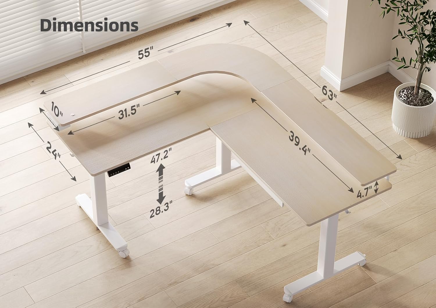 L-Shaped Design: The large L shaped standing desk with drawers isperfect for any corner of your home or office. Its sleek, modern design seamlessly complements a variety of home and office settings.