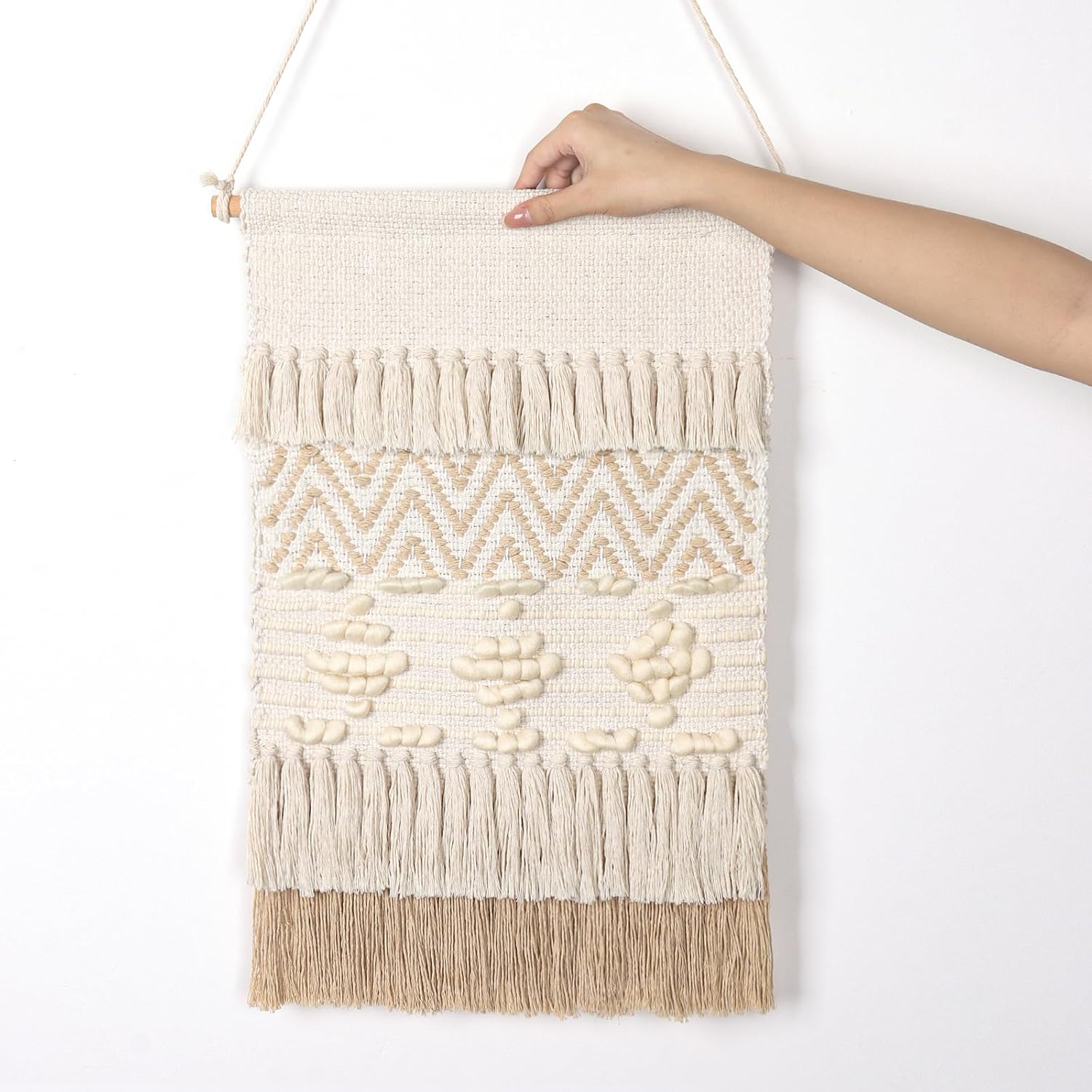【Size&Detail】: Approx 15.7″ W x22″ L (Not including the length of hanging rope, the hanging rope can be adjusted). Packaging Included A Macrame Wall Hanging + Two non-trace nails + A hemp rope + A wooden Stick.