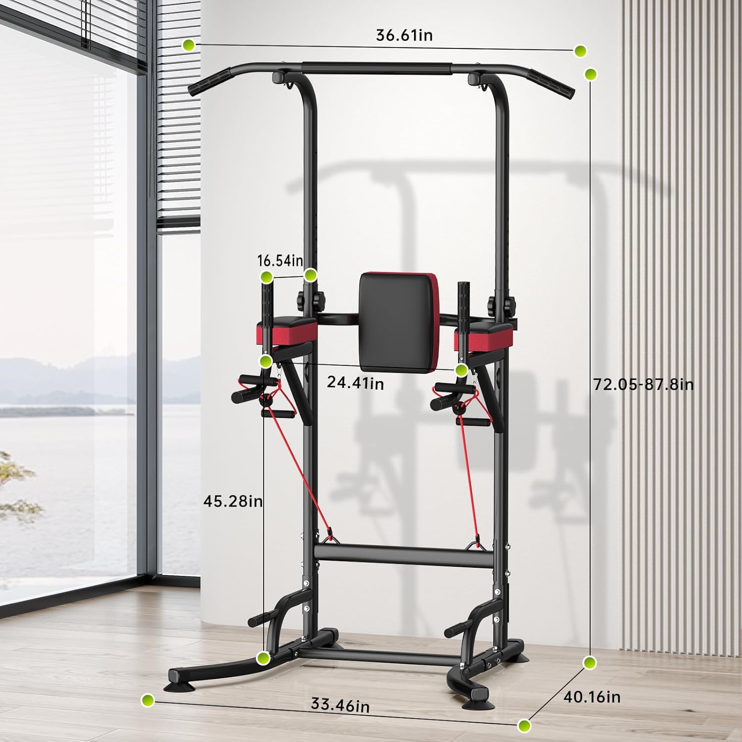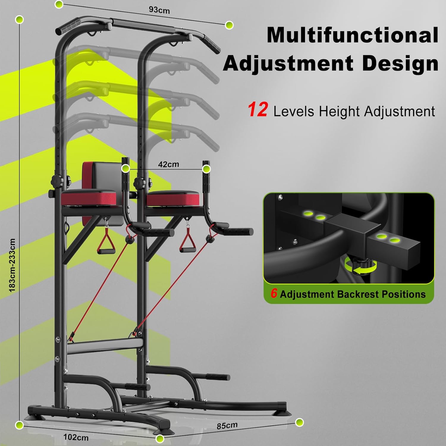【13 POSITION HEIGHT EASILY ADJUSTABLE】 Dskeuzeew power tower pull up bar featuring 13 Quickly adjustable height (72.05″-87.8″) and the pull up and dip station holder has 6 adjustable positions for a wider backrest and 24.41″ hand spacing , our pull up bar station users from 4′ 11″ to 6′ 5″ tall. The pull up stand in ergonomic design ensures perfect form for both teens and adults at every height setting – just adjust, lock, and train!