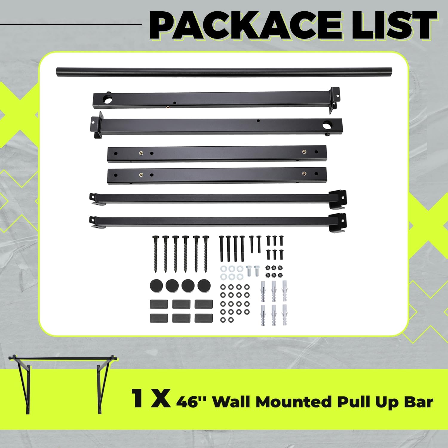 Package list: 1 X 46” Wall Mounted Pull Up Bar, hardware shown in the picture is included. Instruction is included.