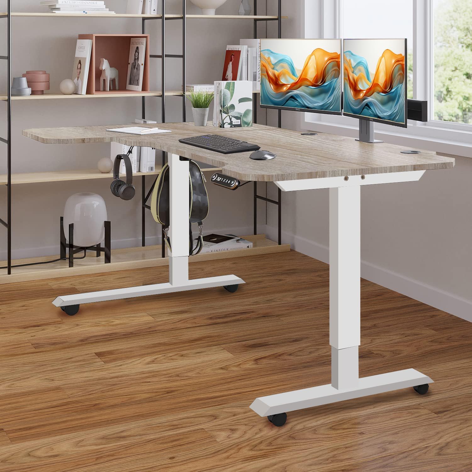 Ergonomic Spacious Workspace:Spacious 59” eco-friendly desktop offers a ample room for a variety of monitor or laptop. The standing desk comes with an additional hook accessories and wire basket for hanging headphones, umbrellas, socket or other items to keep your office area neat and tidy.