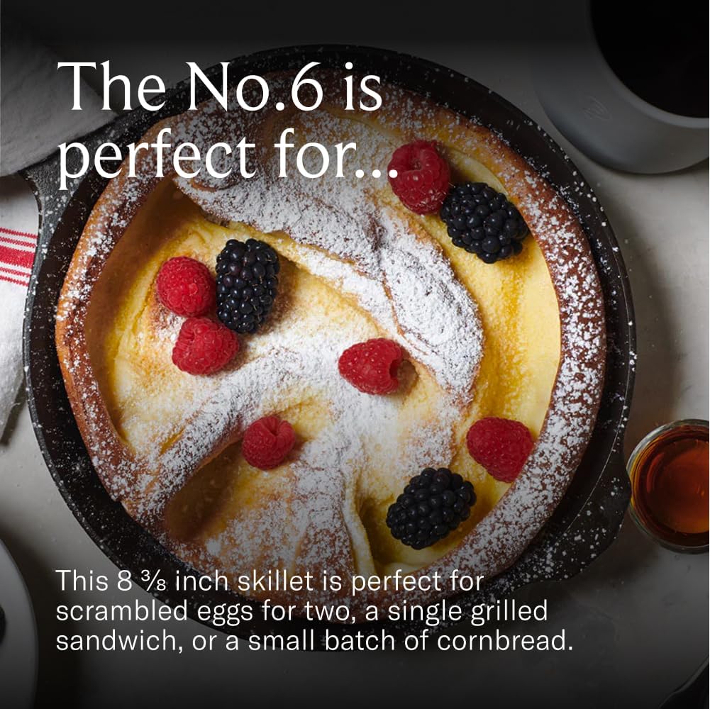 SIZING & USE: 8⅜” total diameter (rim to rim) 7″ flat cooking surface (the actual space for food) 14″ total length including handle 1⅝” wall height 3 lbs weight. This smaller size is perfect for couples or small portions and ideal for cooking 1-2 servings – perfect for scrambled eggs for two, a single grilled sandwich, or a small batch of cornbread.