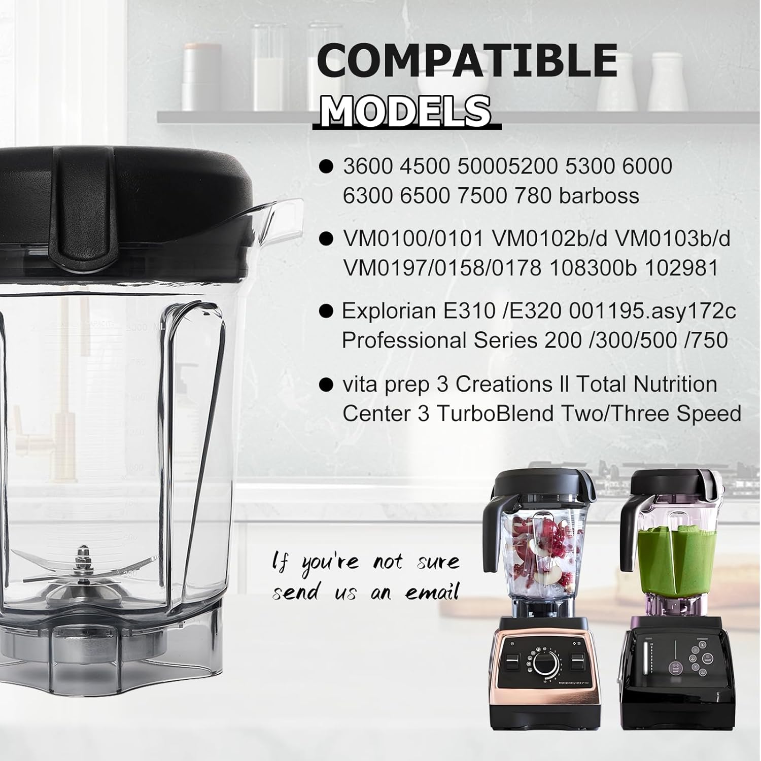 【Compatible With Vitamix Blender Pitcher】The 64oz low-profile blender pitcher designed to process large batches with a lightweight design that fits easily under most kitchen cabinets. Compatible with vitamix blenders many series; classic G/C/ commercial /explorian series blenders: 4500, 5000, 5200, 5300, 6000, 6300, 6500, 7500, 780, Explorian E310/E320, Professional Series 200/300/500/750, A 2300/2500, Creations II, TurboBlend Three Speed, TurboBlend Two Speed, TurboBlend VS, VM0101, VM0102, VM0103, VM0109, VM0197.
