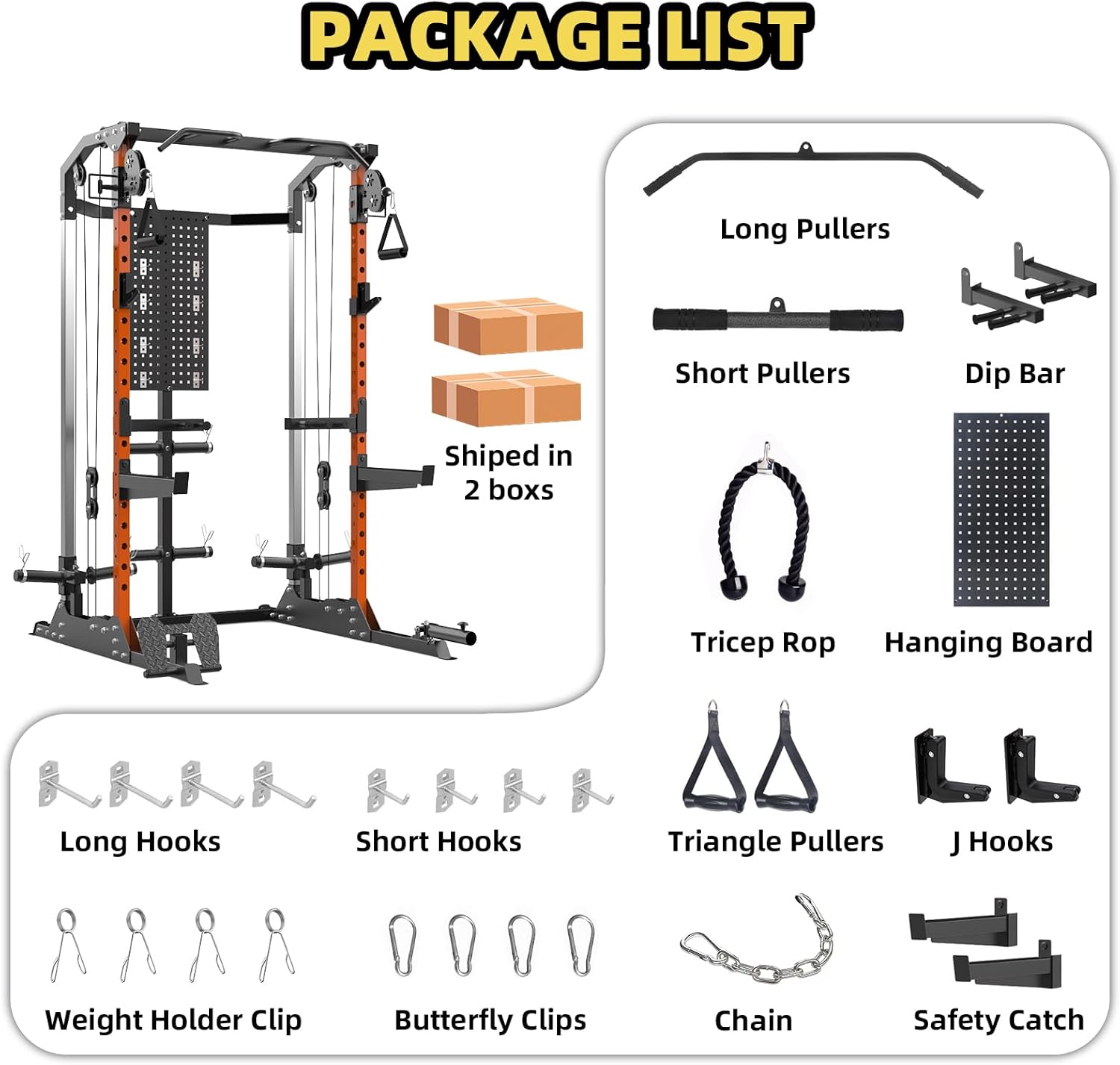 Complete Workout Rack Package & Easy Setup: Includes cable crossover, lat pulldown bars, landmine handle, tricep rope, ankle strap, clips, hooks, and storage board. Comes with manual and video guide for quick assembly of your power racks for home gym