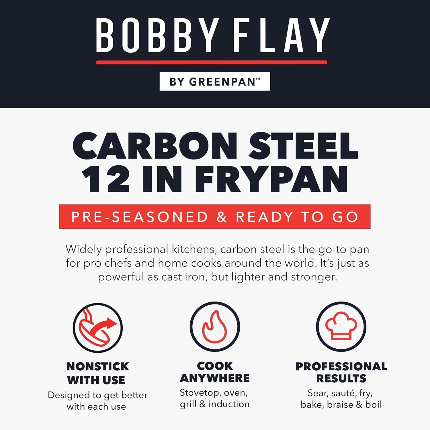 GreenPan x Bobby Flay 12″ Carbon Steel Frying Pan Skillet, Pre-Seasoned Ready to Use, Nontoxic, PFAS-Free, Induction Compatible, High Heat & Oven Safe Durable Cookware, Cast Iron Alternative