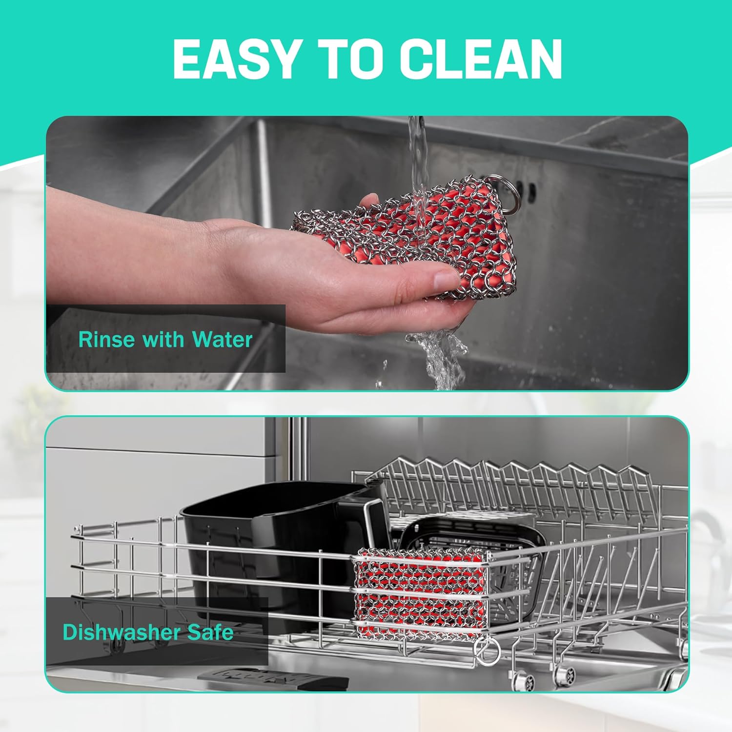Easy to Maintain: After using the cast iron chainmail scrubber, you can either clean it in the dishwasher or wash it manually; Because of high-quality material, no residue will remain; Plus, the hanging ring makes drying and compact storage easy