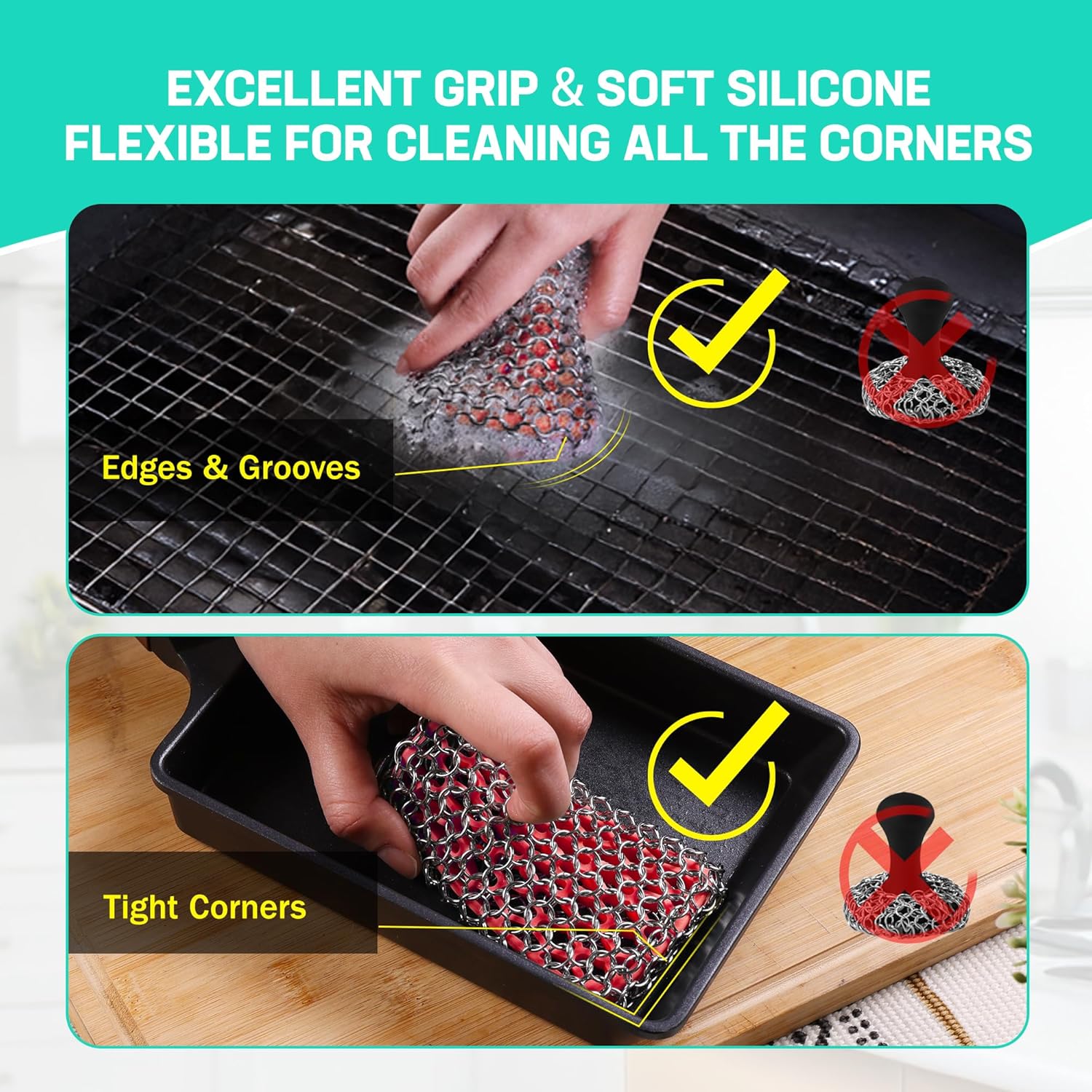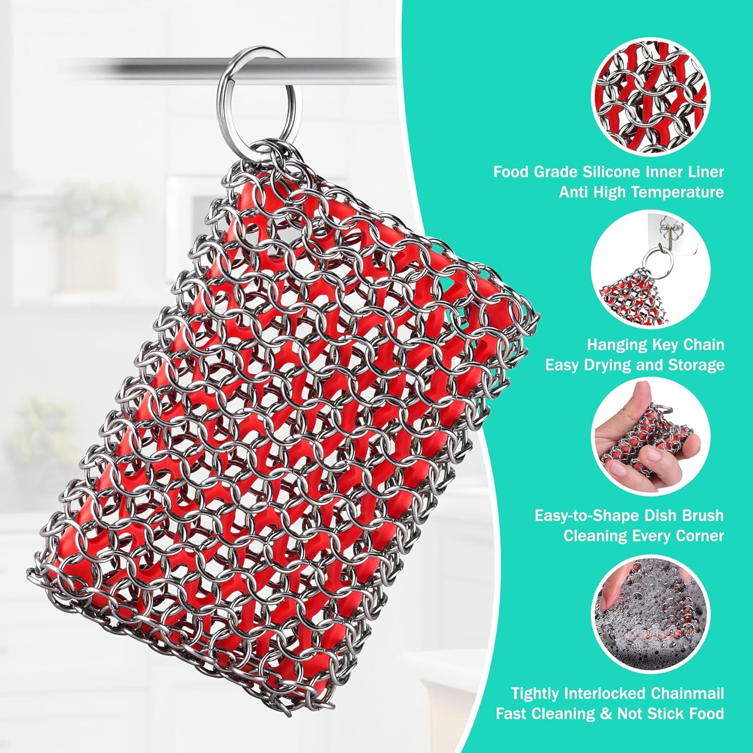 Breathable Soft Liner: Silicone lining supports the chainmail, preventing buildup and making cleaning easier; Flexible silicone pad adapts to different cookware shapes; Additionally, honeycomb holes prevent food from sticking and allow for quick drying, keeping cookware clean and fresh