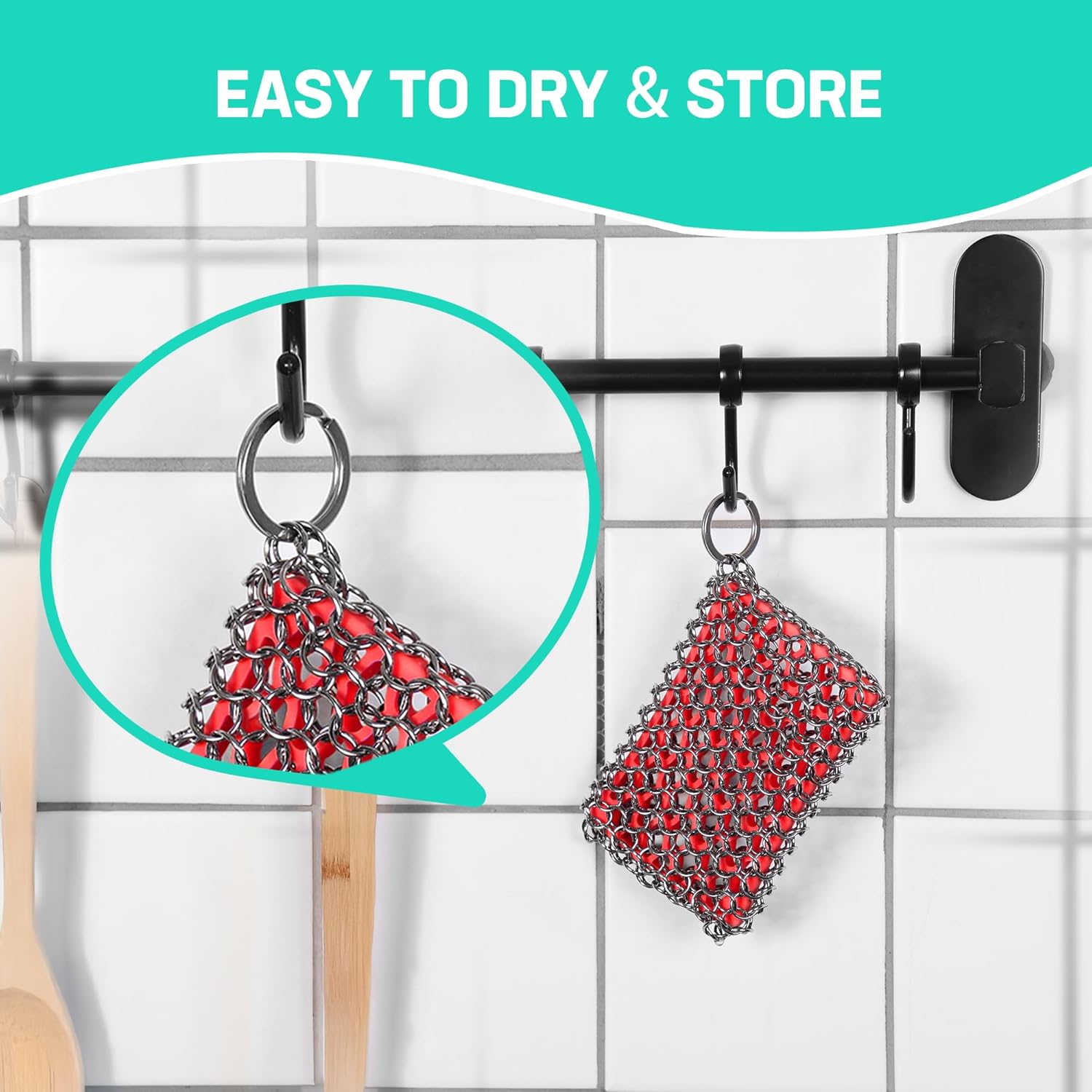 Easy to Maintain: After using the cast iron chainmail scrubber, you can either clean it in the dishwasher or wash it manually; Because of high-quality material, no residue will remain; Plus, the hanging ring makes drying and compact storage easy