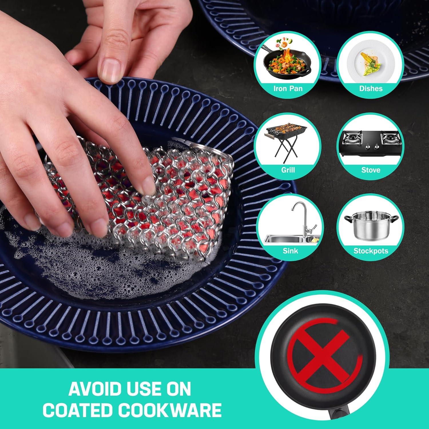 Quick Cleaning: Food-grade stainless steel rings are designed to remove stuck-on food, without damaging the seasoning; The tightly woven rings effectively clean the nooks and crannies of cast iron skillets; Please note, this chainmail scrubber is not suitable for coated cookware as it will damage non-stick surfaces