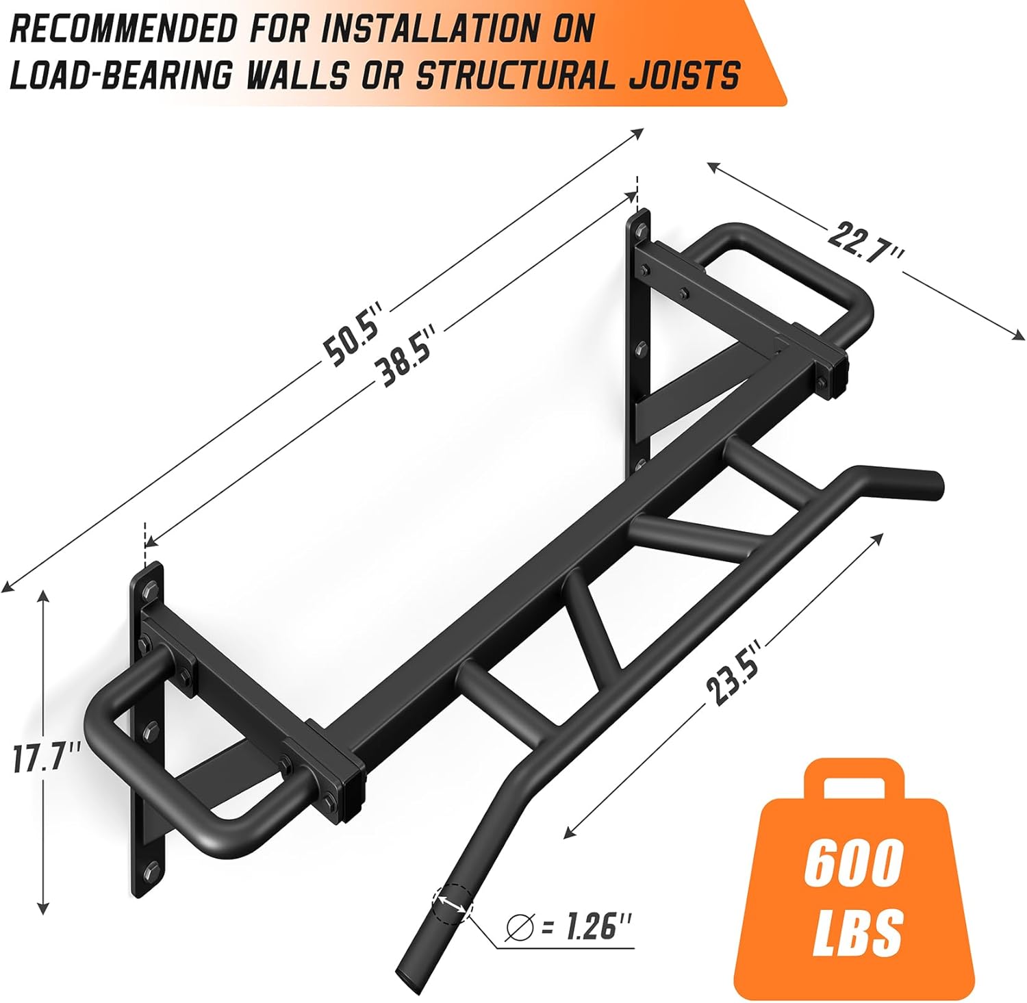 📦Sturdy and Durable: Made of 32mm diameter steel pipes and high-quality spray painting technology, chin up bar is rust-proof and durable. Reinforced by a 5mm solid iron plate with 6 bolt holes, it has rock-like stability and can support 600 lbs